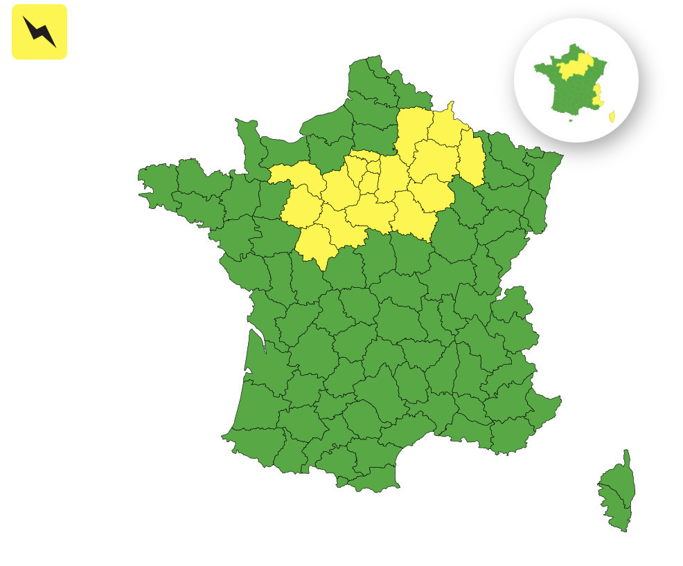 Les départements placés en vigilance jaune pour orages ce jeudi sont notamment Paris, la Seine-et-Marne (77), les Yvelines (78), l'Essonne (91), les Hauts-de-Seine (92), la Seine-Saint-Denis (93), le Val-de-Marne (94) et le Val-d'Oise (95), soit l'ensemble des départements de la région Île-de-France. Au-delà du Grand Paris, l'alerte s'étend également à des départements proches comme l'Eure-et-Loir, le Loiret, l'Aube, la Marne, l'Yonne ou encore l'Aisne.