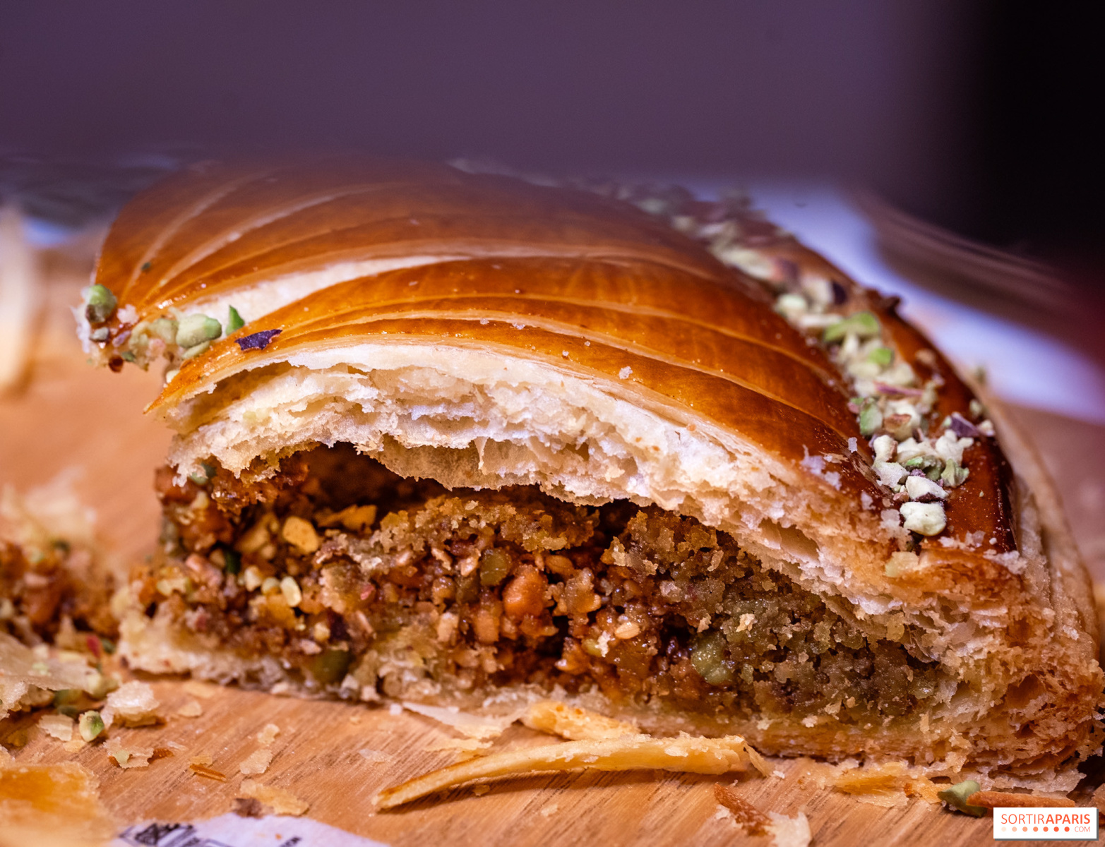 On file découvrir cette création limitée qui s'éloigne des sentiers battus de la frangipane classique. Ici, le feuilletage pur beurre AOP doré et ultra-croustillant se pare d'éclats de pistache qui annoncent déjà la couleur. À l'intérieur, on retrouve une garniture inspirée de la baklawa : un mélange généreux de pistache, amande et noisette, subtilement lié par une touche de miel. Cette farce riche et fondante crée un équilibre parfait entre tradition française et influences orientales.