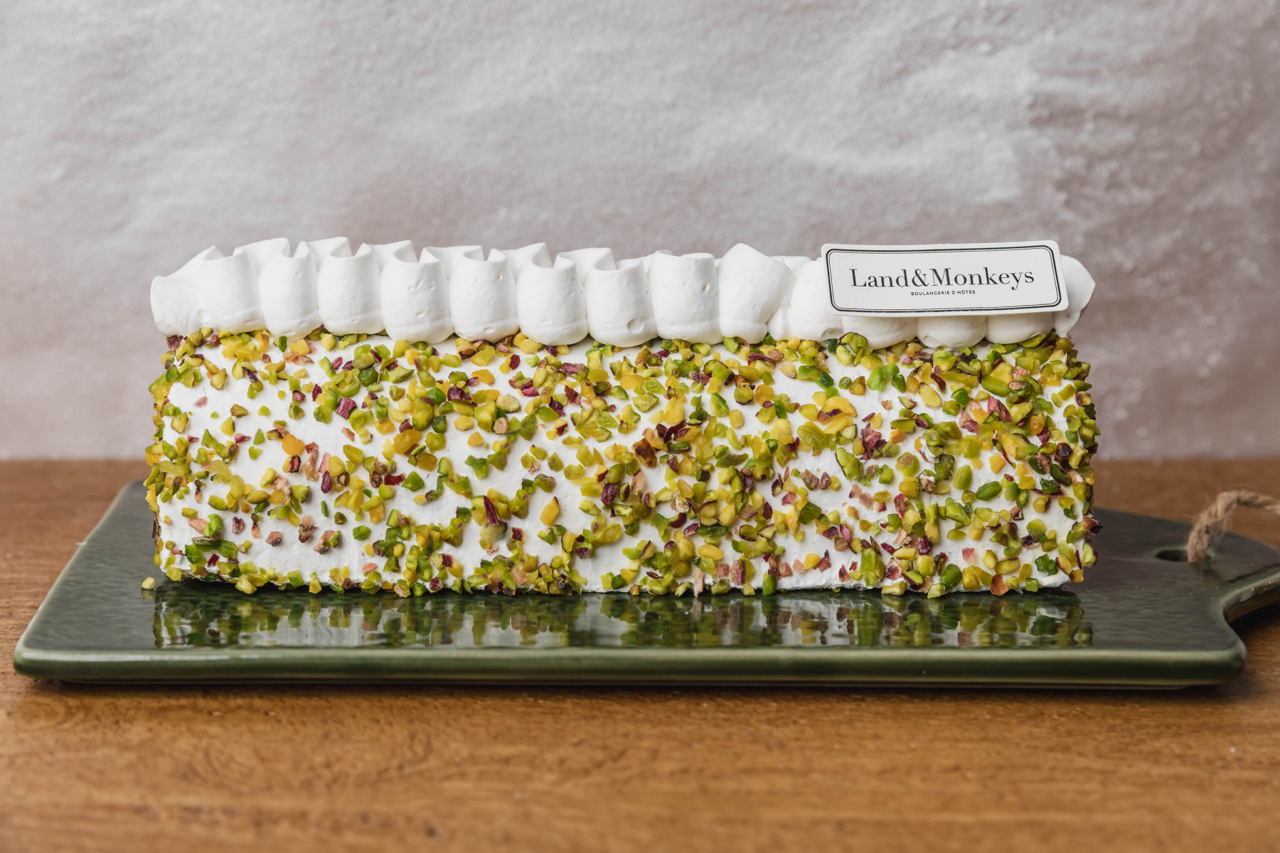 Nouveauté de l'année, la bûche à la pistache sous toutes ses formes, du biscuit génoise moelleux au croustillant, le tout surmonté d'un praliné maison et d'éclats de pistache concassée, avec une ganache montée à la fleur d'oranger onctueuse.