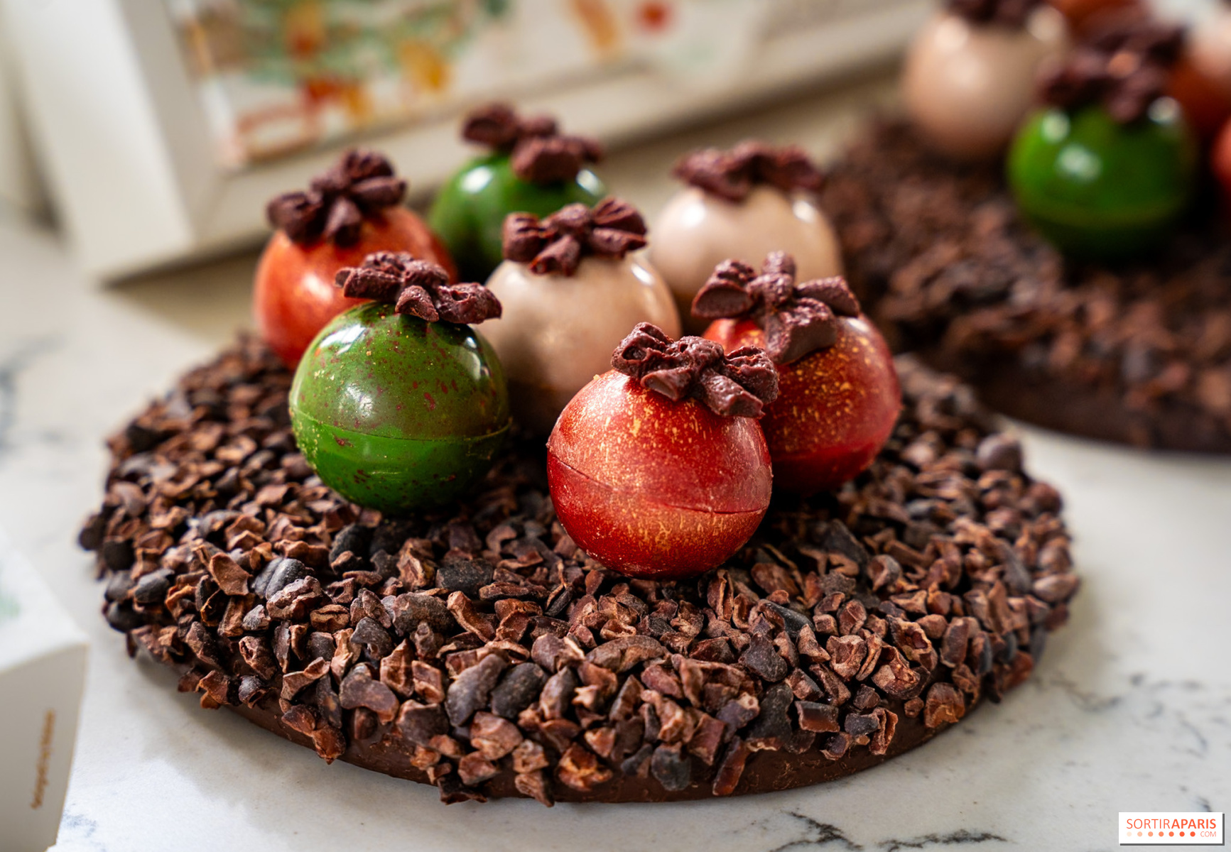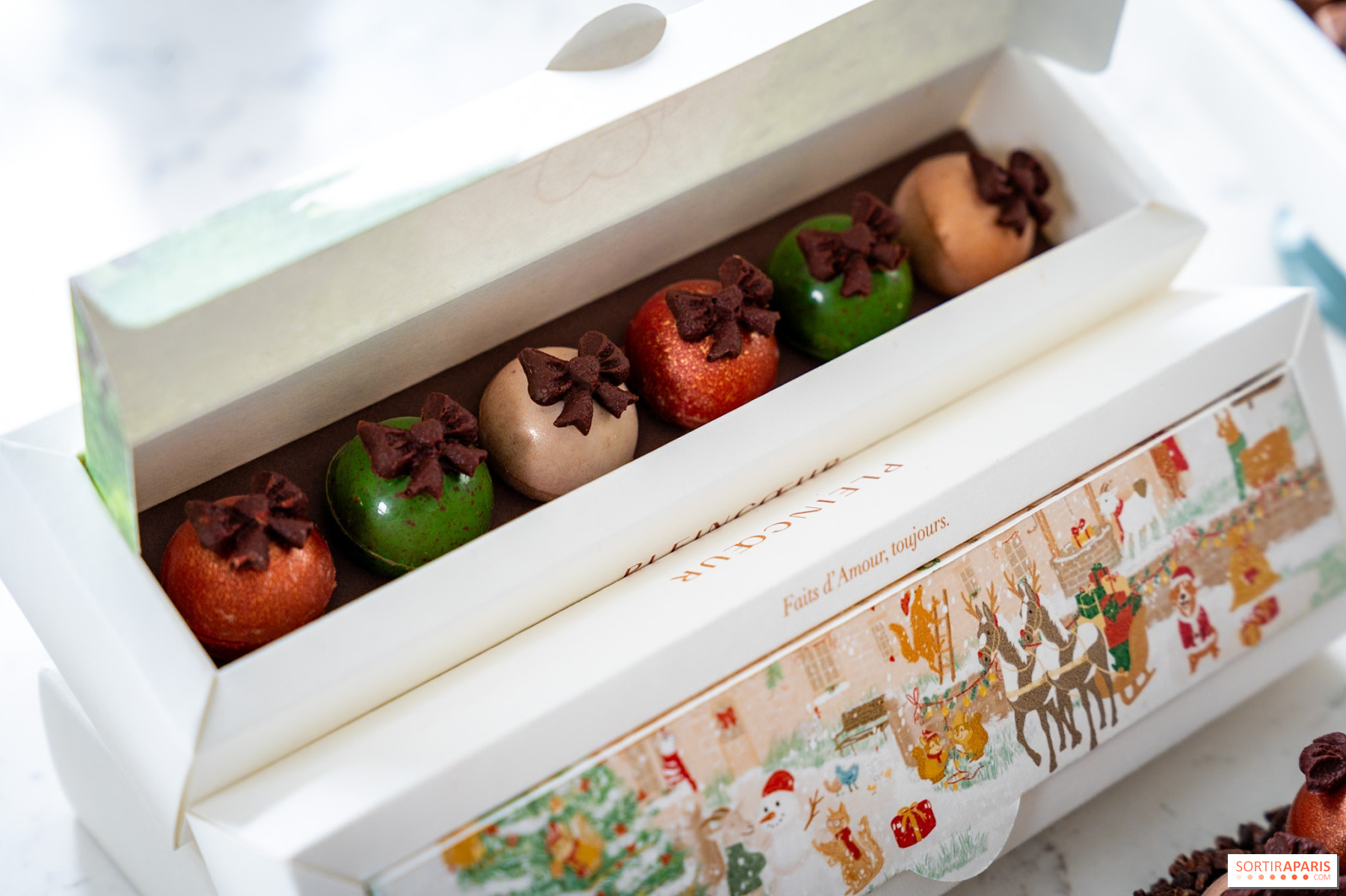 Ces boules reprennent les codes des célèbres oeufs du verger de la maison sous une nouvelle forme festive. On y trouve du praliné spéculoos avec caramel filant vanille, du coco avec caramel fruit de la passion et de la pistache avec caramel fleur d'oranger. Trois parfums qui sentent bon Noël !