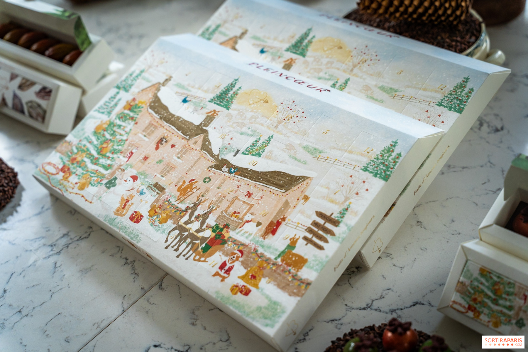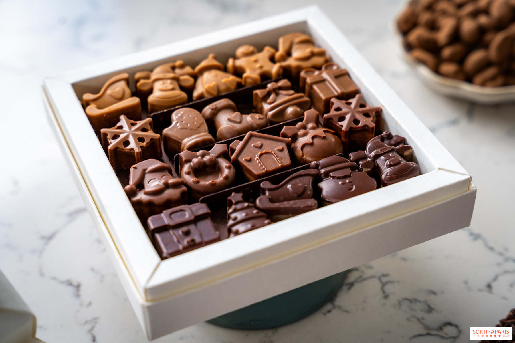 24 douceurs pour patienter avant Noël avec 12 bouchées au praliné, 3 fruits secs enrobés de chocolat (noisette, cacahuète, amande), 2 boules de Noël, 1 orangette praliné noir, 1 cœur noisette, 1 moule ancien lait, 1 moule ancien noir, 1 oeuf, 1 ourson caramel praliné et 1 cabosse cacao. Chaque jour, une nouvelle surprise pour se régaler en attendant les fêtes !