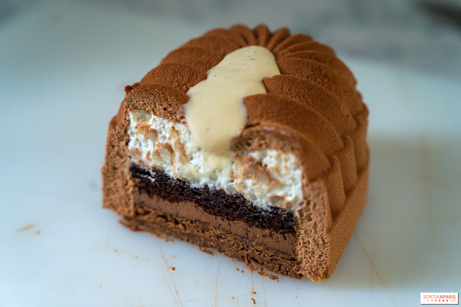 Cette bûche nous ramène tout droit en enfance avec un hommage au merveilleux riz au lait de la maman de Maxime. On adore cette idée de transformer un souvenir familial en création pâtissière ! Le crémeux du riz contraste avec un double croustillant praliné (noisette et amande), tandis que la douceur du lait est réhaussée par l'intensité du chocolat. On y retrouve une mousse chocolat grand-mère, un crémeux chocolat, un biscuit chocolat sans farine, un riz au lait impératrice allégé à la crème montée et une confiture de riz au lait. Que de souvenirs en une seule bouchée !