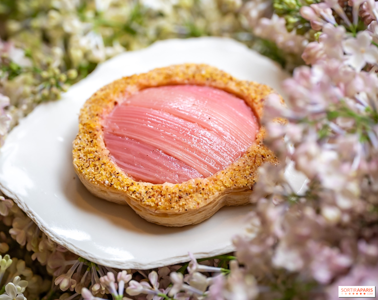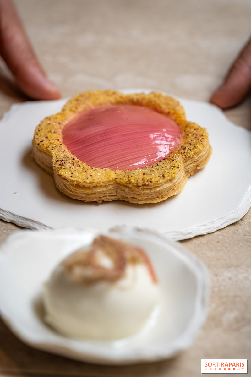 La tartelette feuilletée au cheesecake à la baie de genièvre surprend avec ses accents épicés et sa rhubarbe confite fondante, accompagnée d'une glace maison au lait d'amande. Un équilibre inattendu entre acidité, douceur et rondeur.