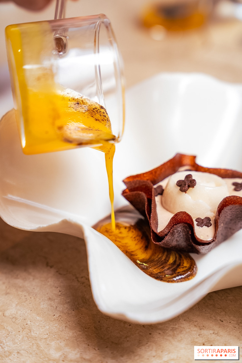 Le voyage continue avec un prédessert autour de la mangue : une tartelette façon tulipe garnie de mangues rôties et de crème crue, accompagnée d'un sorbet au mucilage et d'un jus de mangue réduit au vinaigre doux. Fraîcheur et vivacité s'équilibrent dans une bouchée d'une grande élégance.