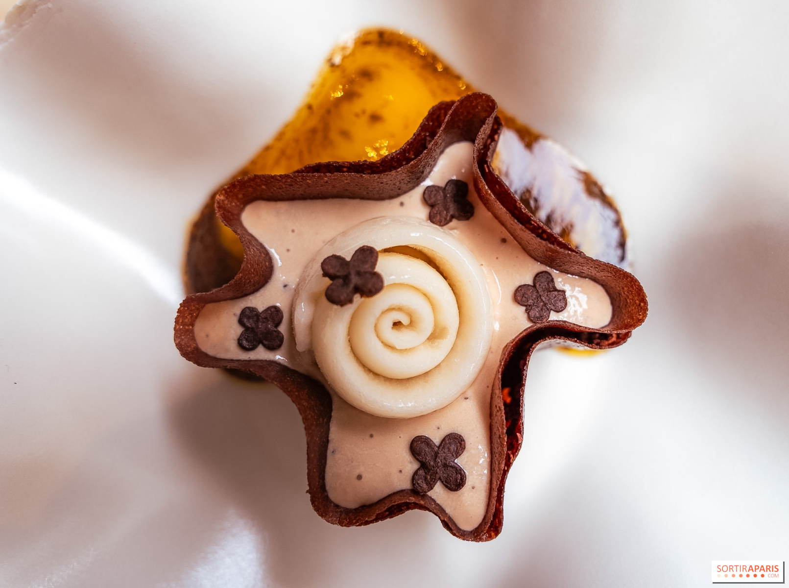 Le cœur de la dégustation, c'est une crêpe soufflée au chocolat noir Samana et Pérou, aux notes épicées et délicatement fruitées, accompagnée d'une glace au grué de cacao et à la vanille enveloppée d'une fine gavotte croustillante.