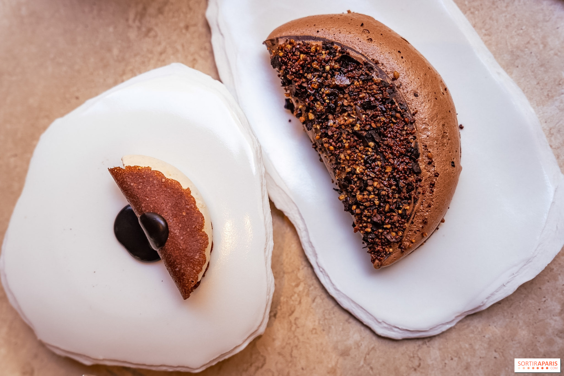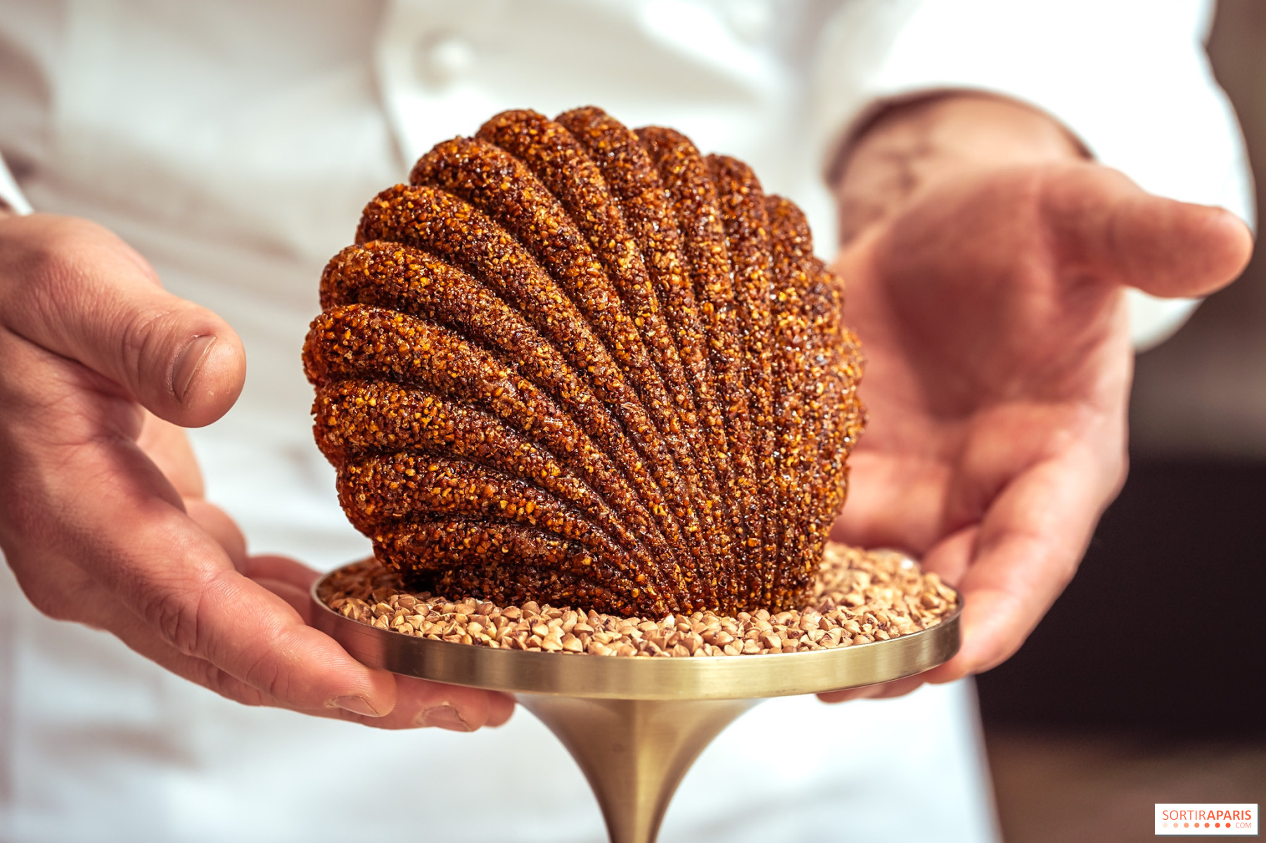 Point d'orgue de ce tea time, Guillaume Cabrol a façonné un gâteau battu en forme de coquille Saint-Jacques, généreusement parsemé de pépites de chocolat et recouvert d'une croûte de sobacha aux parfums beurrés et cacaotés. Un geste artisanal qui rappelle le goûter d'après l'école, en bien plus raffiné.