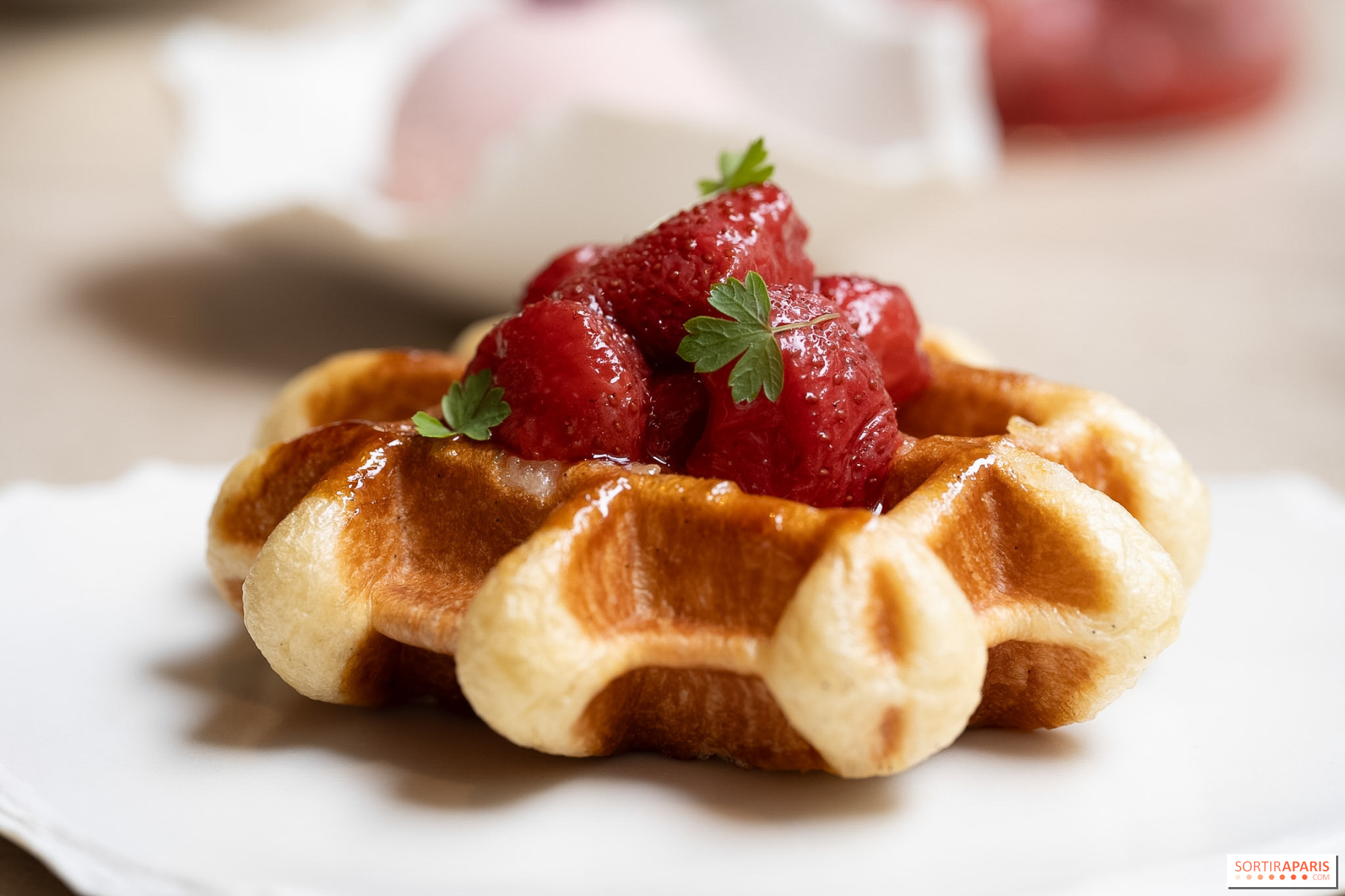 Vient ensuite ce qui ressemble fort à une madeleine de Proust : une gaufre liégeoise vanillée, servie avec des ciflorettes(les premières fraises de la saison), une crème glacée à la fraise et une crème crue. Chacun compose sa dégustation à sa guise, c'est gourmand et spontané à la fois.