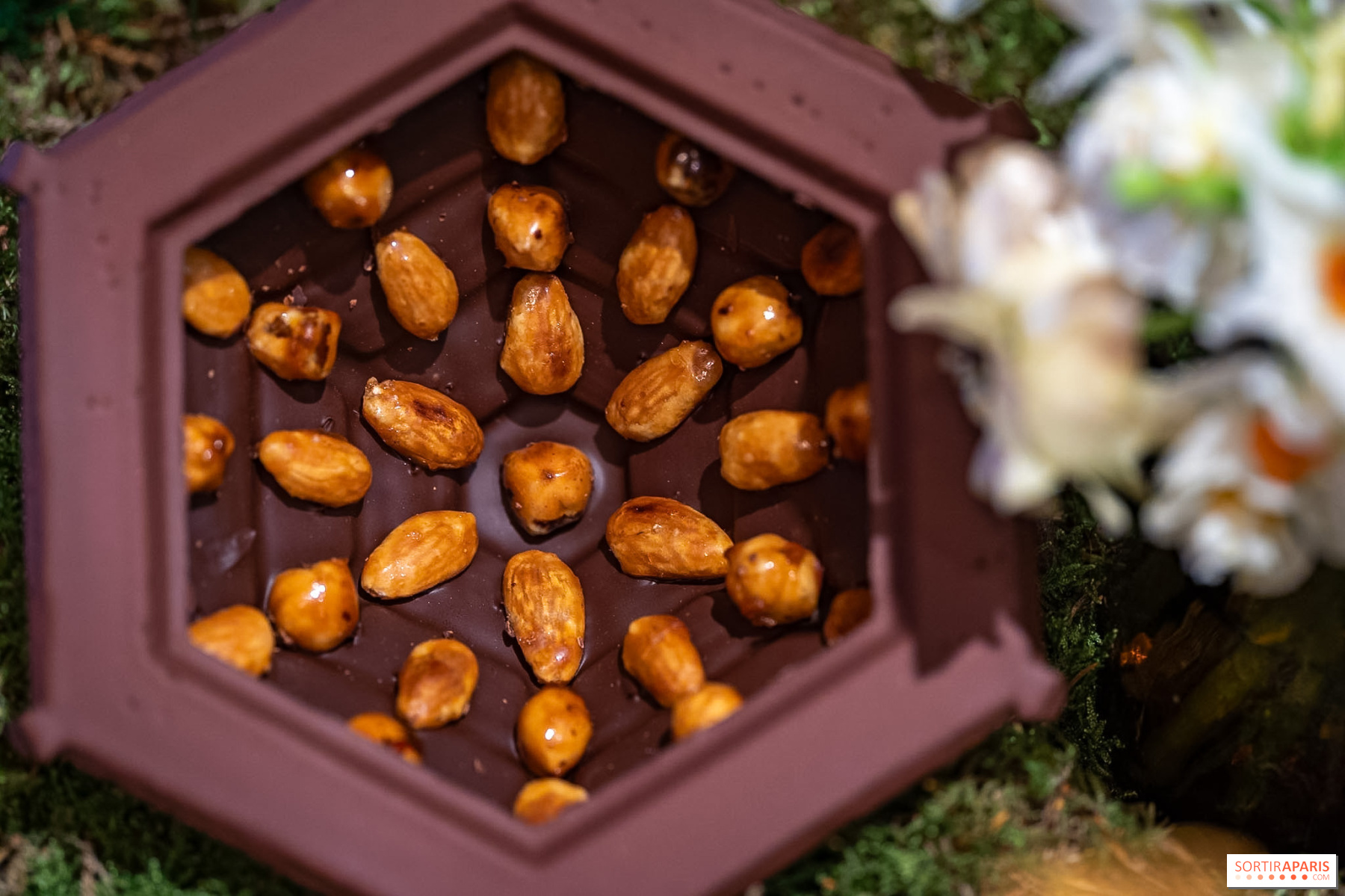 La partie supérieure est garnie de noisettes et d'amandes caraméliséesqui apportent un croquant bienvenu. Le socle, lui, cache une tablette "essaim d'abeille" composée d'un praliné amande-noisette onctueux, d'éclats de sablé croustillant au pollen et d'un gel au pollen aux accents floraux surprenants. Une ganache au miel douce et soyeuse vient lier l'ensemble avec beaucoup de justesse. L'intégralité de la ruche est réalisée en chocolat noir 65 % d'origine Colombie, sélectionné auprès du chocolatier Nicolas Berger, dont les notes fruitées naturelles font contrepoids à la richesse du praliné et à la douceur du miel.