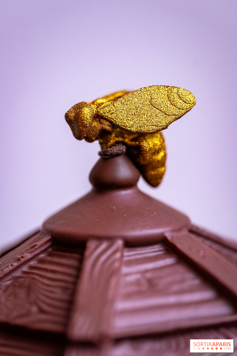 Le Shangri-La Paris n'a pas choisi le motif de la ruche au hasard : ses salons historiques abritent le symbole de l'abeille, emblème de la famille Bonaparte. Timothy Lam s'en est emparé pour imaginer une ruche au design architectural, aux volumes sculptés et aux textures travaillées, couronnée de délicates abeilles dorées en chocolat. Loin de l'oeuf classique, on est davantage face à une pièce que l'on hésite presque à croquer. Presque.