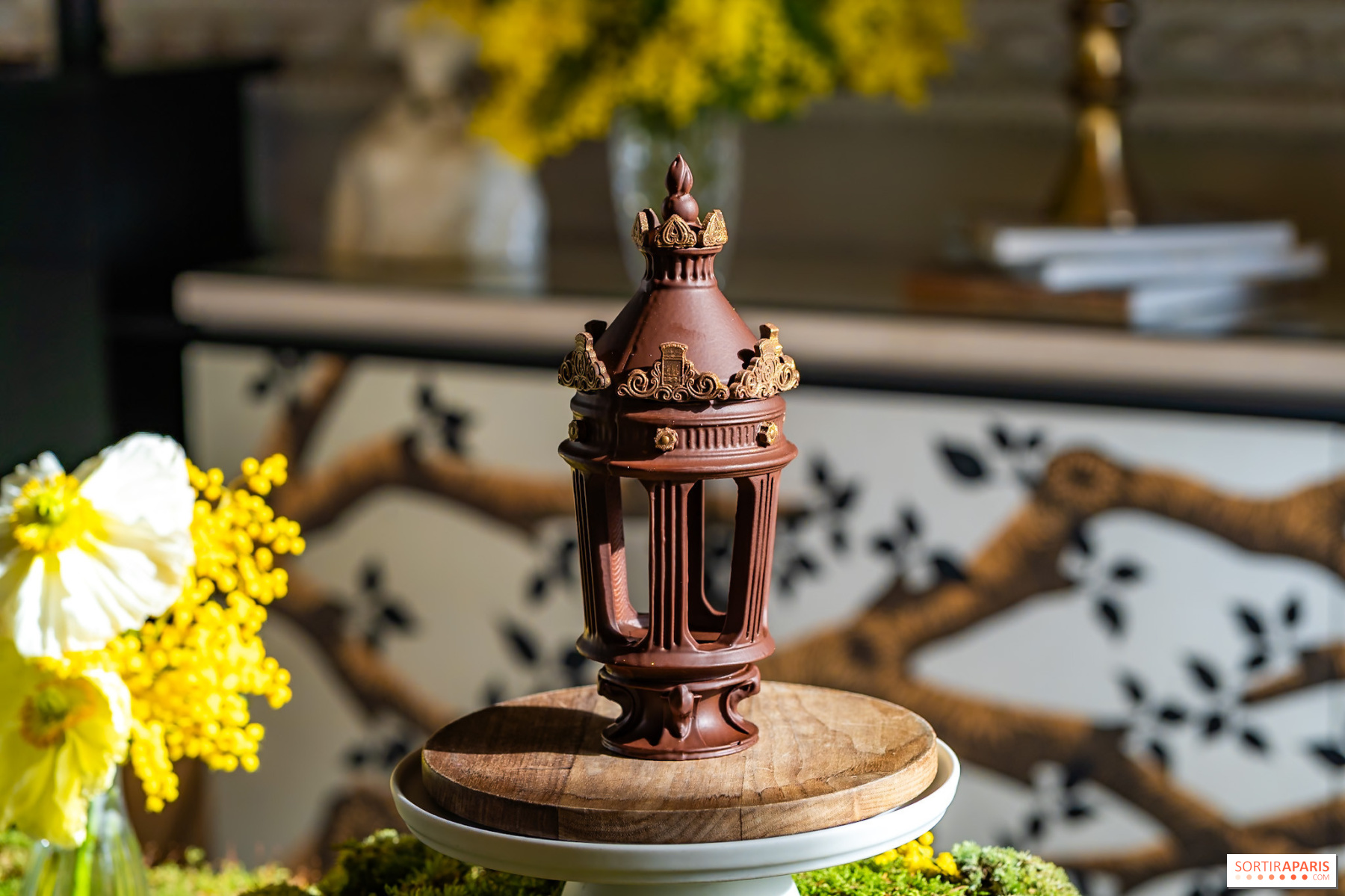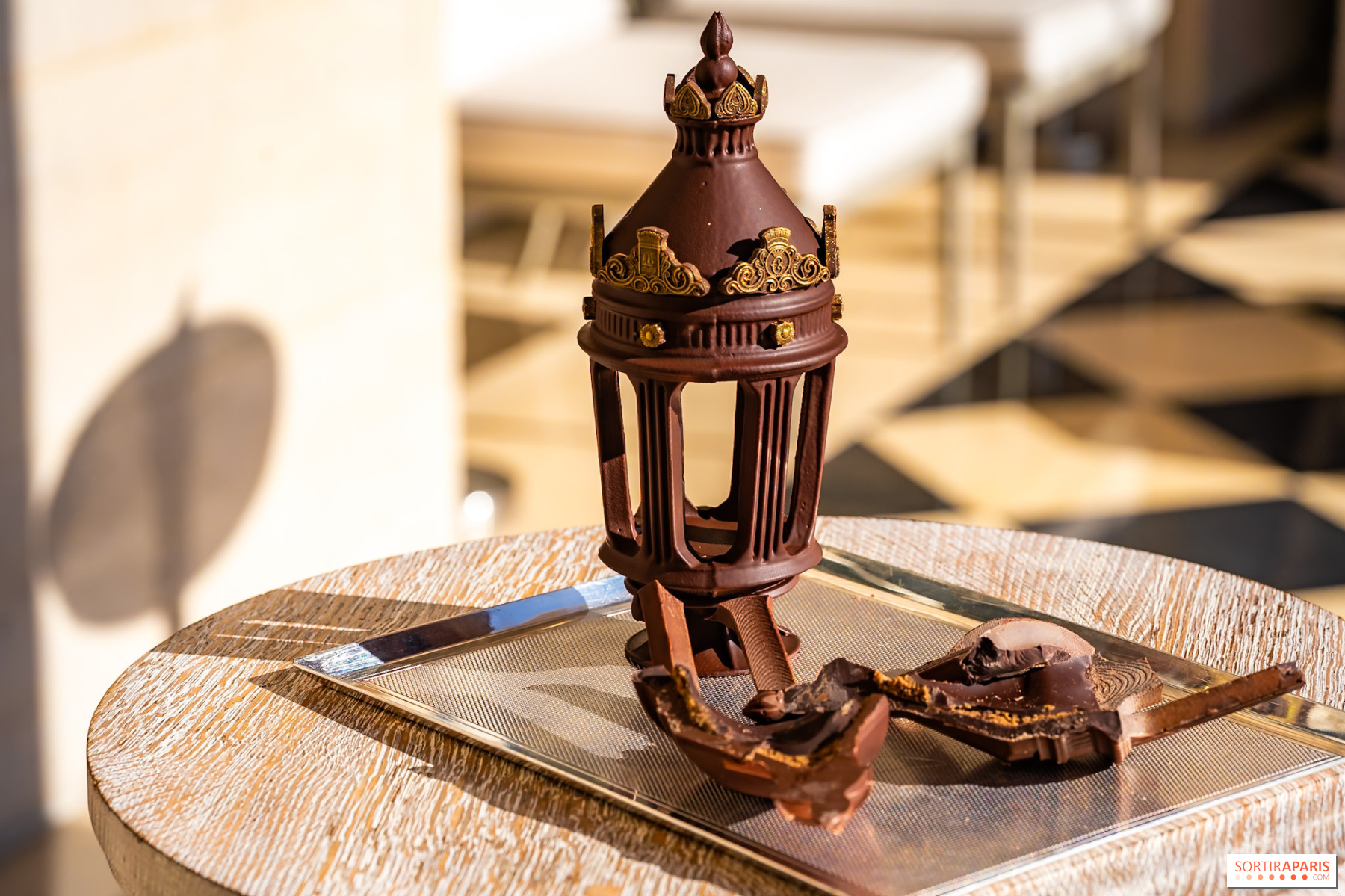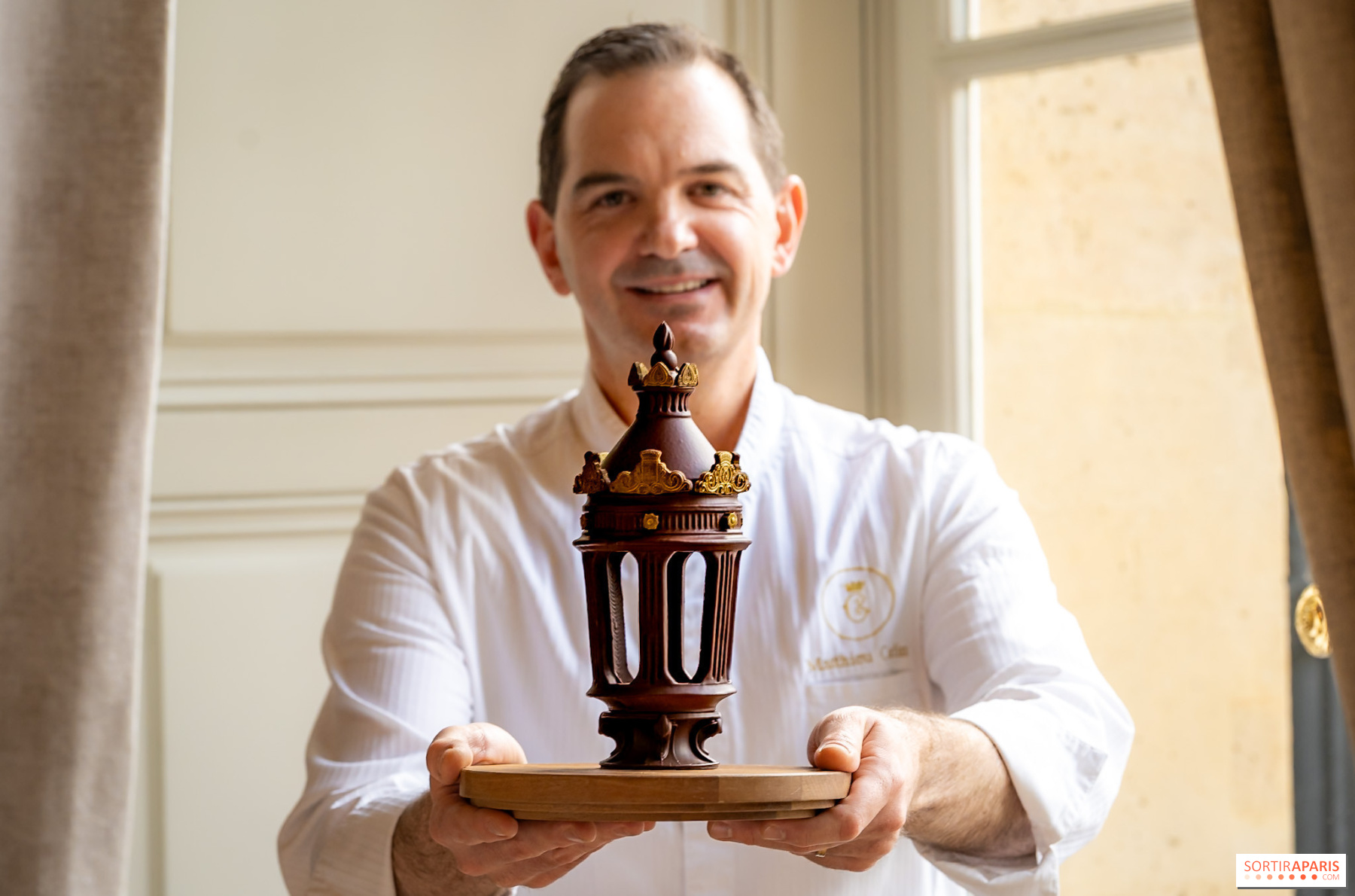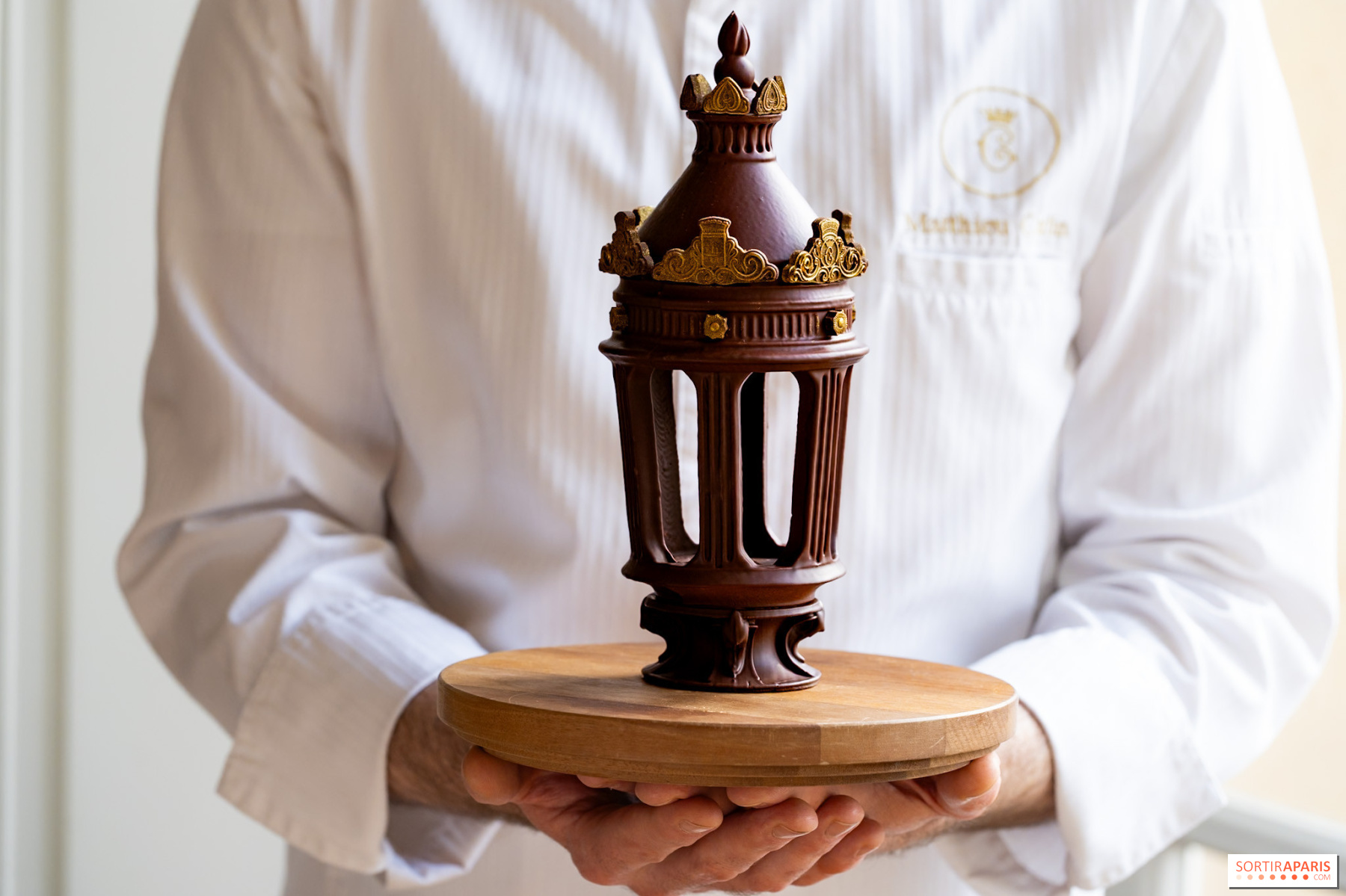 Cette année, Matthieu Carlin braque son regard vers l'un des éléments les plus familiers du paysage parisien : le lampadaire de la Place de la Concorde, dessiné au XIXe siècle par l'architecte Jacques-Ignace Hittorff. Ses lignes élégantes sont réinterprétées en une sculpture en chocolat dont la couronne intègre subtilement le logo de l'Hôtel de Crillon et le symbole de la Ville de Paris. Une pièce qui projette sa propre lumière sur l'histoire de la place et ses fontaines, comme le souhaitait le chef en imaginant cette création.