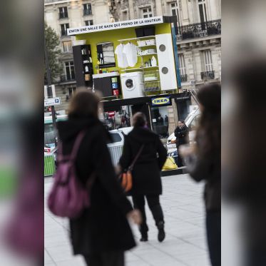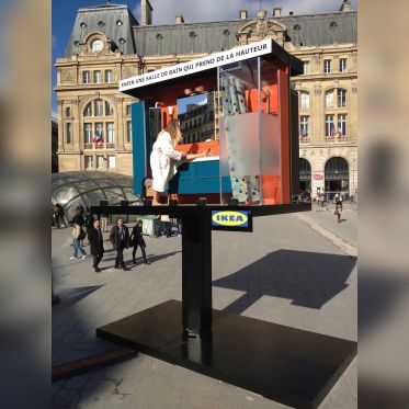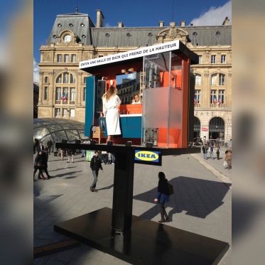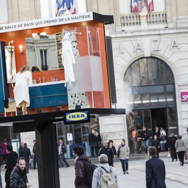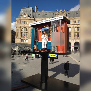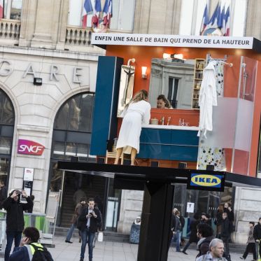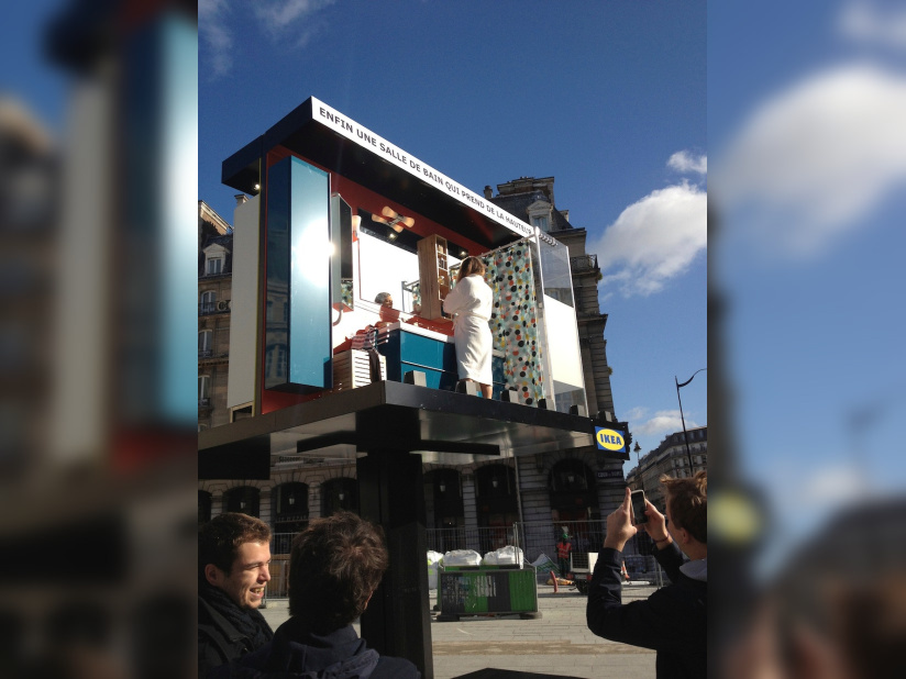 Après la gare, le métro, les abribus, l’aéroport ou encore les bulles Autolib’, IKEA perpétue depuis 2008 sa célèbre saga du détournement du quotidien et expose sur le parvis de la gare St Lazare, une vraie salle de bain et des comédiens interprétant en live les gestes du quotidien...