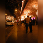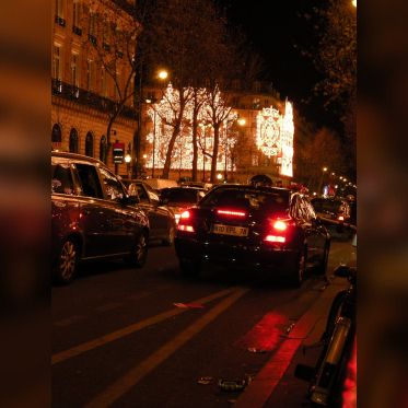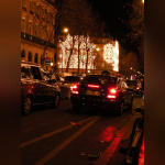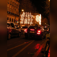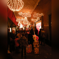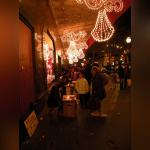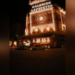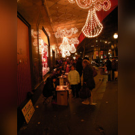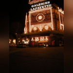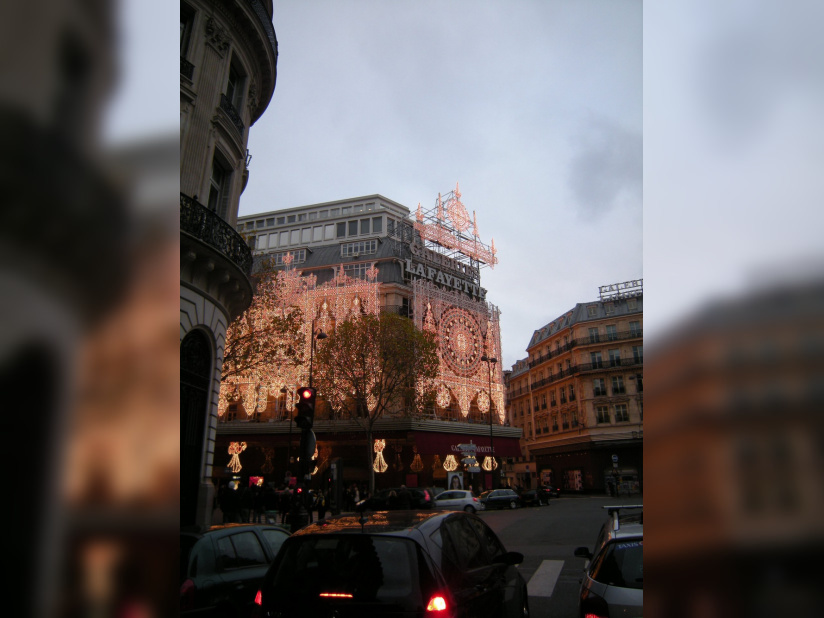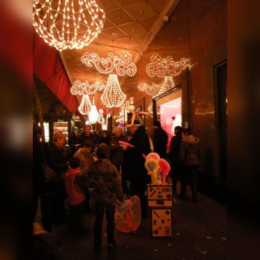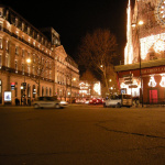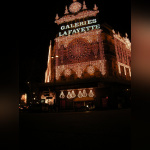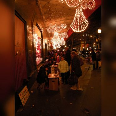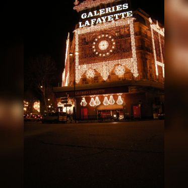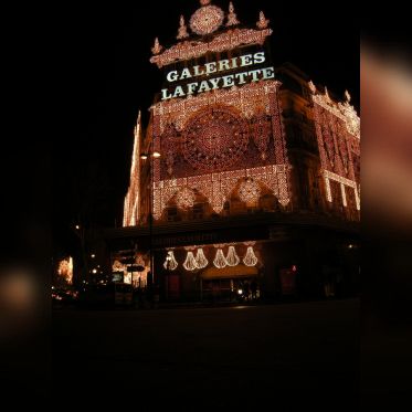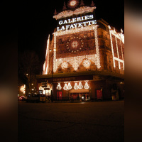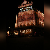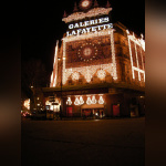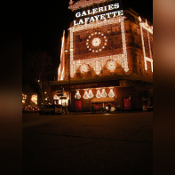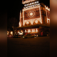 Vision des illuminations de ce grand magasin avec pendant ces jours de fêtes une agitation intense sur les trottoirs et sur le rue.