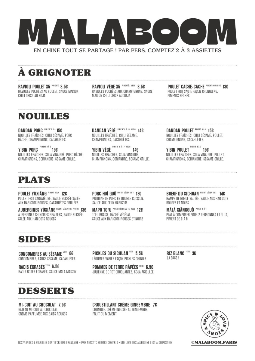 في مطعم مالا بوم، الصيف مرادف للتنوع والانتعاش. بالإضافة إلى طبق مالا شيانغو الشهير لدينا، اكتشف مجموعة من أطباق سيشوان التي يمكن الاستمتاع بها ساخنة أو دافئة أو مبردة. استمتع بتناول نودلز داندان (لحم الخنزير أو الدجاج أو النباتي) المثالية لوجبة غداء خفيفة، أو سلطة البطاطس المبشورة والفجل المطحون المثالية لترافق أطباقك. كل قضمة هي توازن مثالي بين النضارة والتوابل والروائح المسكرة.