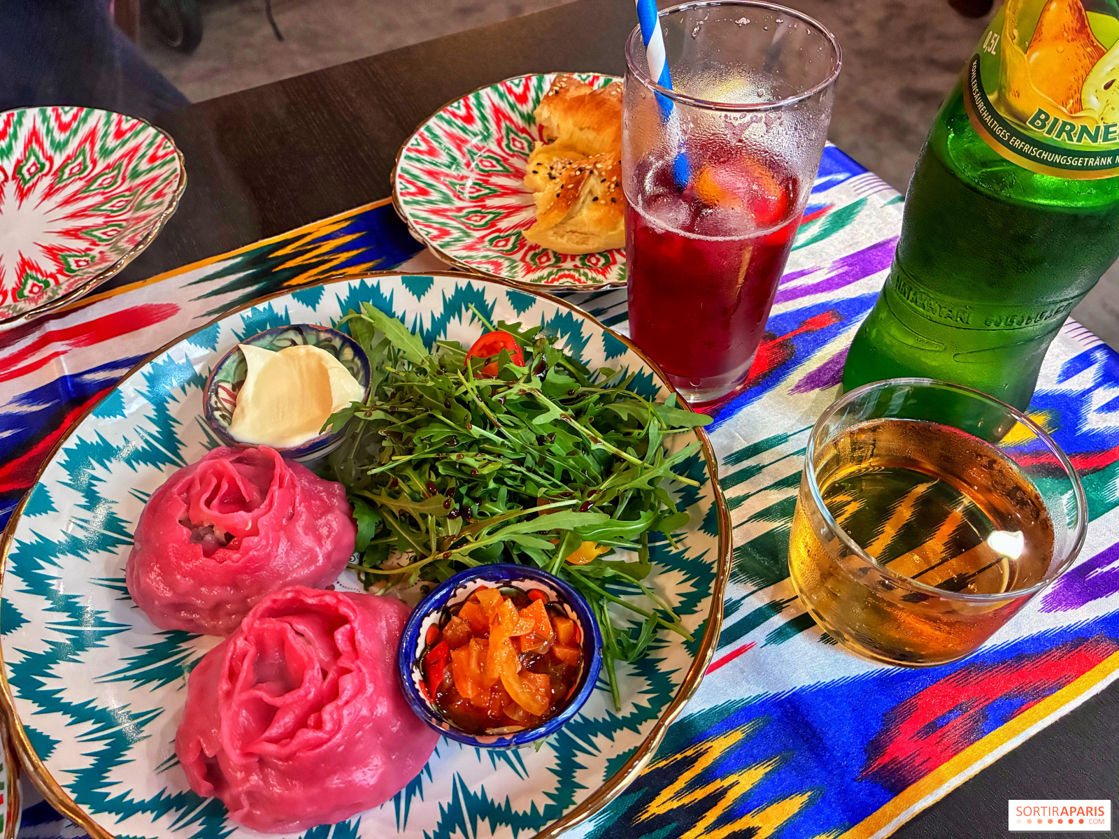 تبدأ التجربة بمشروب مور (4 يورو)، وهو شراب بارد وشعبي في البلدان السلافية، مصنوع من التوت الأحمر والليمون والنعناع (أو من مشروبات أخرى تأتي خاصة من جورجيا) والخبز المنزلي بالسمسم الذي يُعد من الأطباق المشهورة في أوزبكستان (2 يورو)، ويعد من أبرز أسرار المكان، حيث لا يصمد أمامه أحد، حديثًا من الفرن، بنعومته وطعمه من بذور السمسم المحمصة التي تفتح الشهية وتثير الحواس.