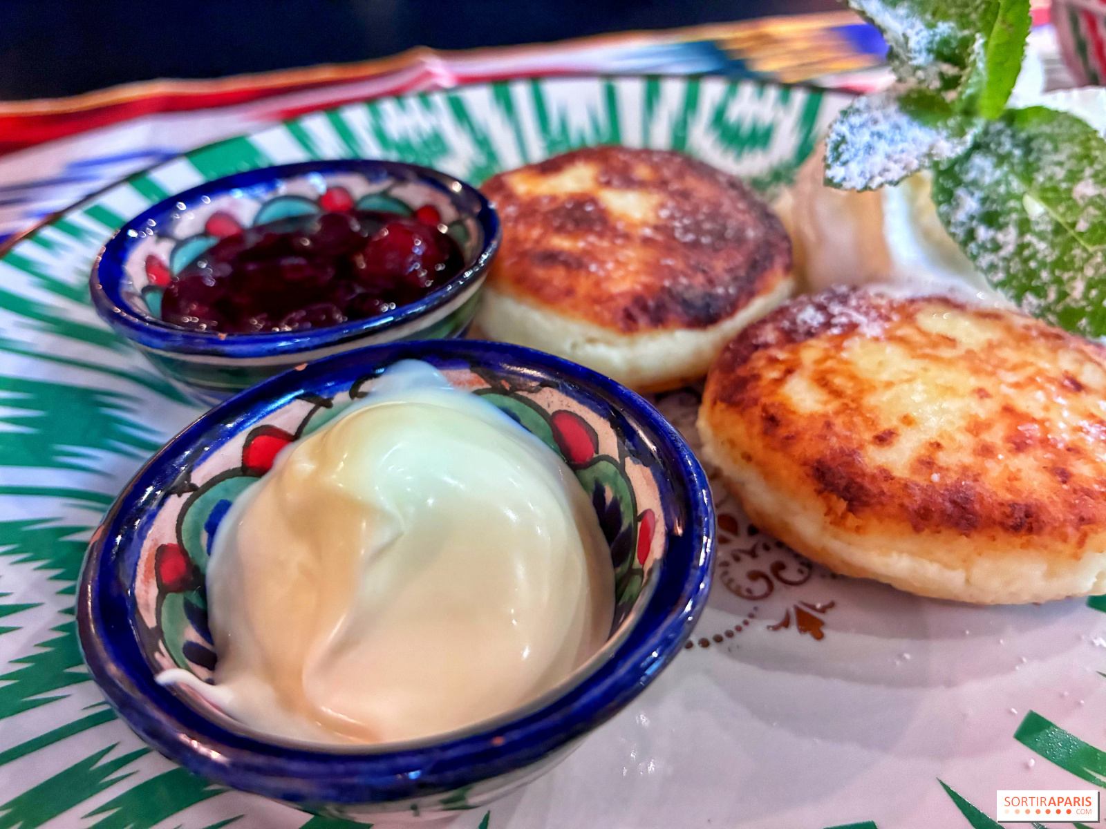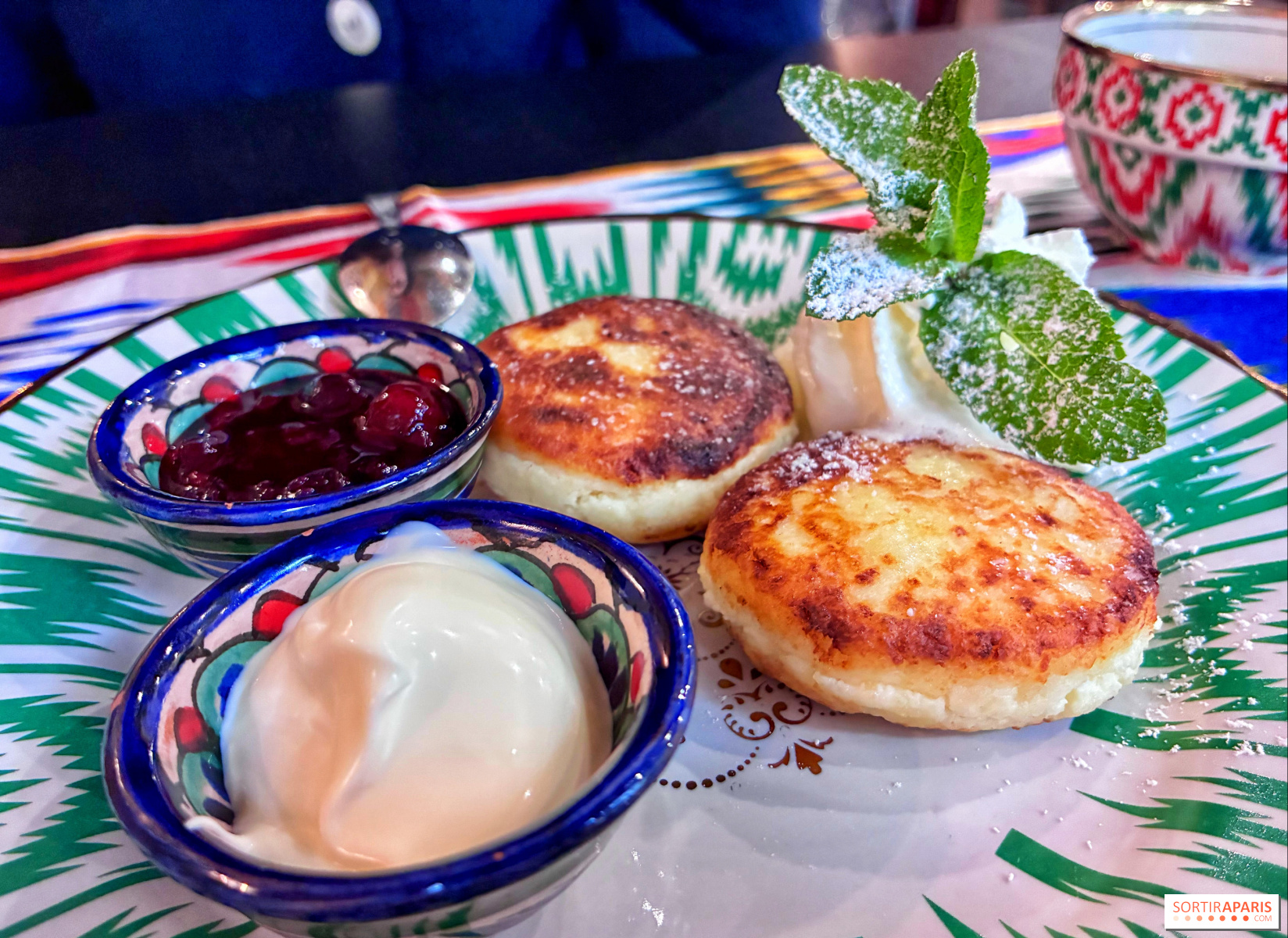 ننهي آخر حصة لنا بمطعمنا بمذاق حلو قليل الحلاوة مع Syrniki (9€)، وهي كعكات صغيرة من الجبن الطازج تُقدم ساخنة مع مربى الكشمش، خفيفة بشكل عام، وتُصاحبها شاي فني وجميل العطر مع العسل والبرتقال.