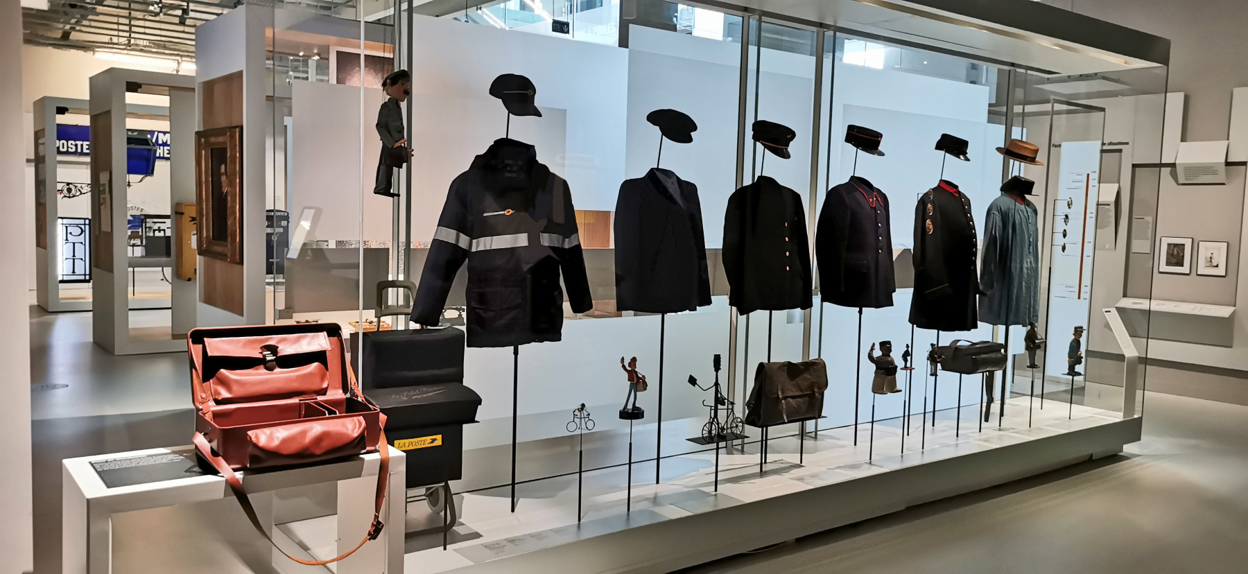 تُسلط معرض خلف الستائر الضوء على تاريخ اللباس المهني في عالم البريد، من عام 1786 وحتى يومنا هذا. كل قطعة لباس، كل إكسسوار يعبر عن خطوة مهمة في التقدم الاجتماعي أو التكنولوجي، أو يعكس تحولًا سياسيًا، أو تغيّرًا في القوانين، أو، بشكل أعم، تطور النظام الاجتماعي.