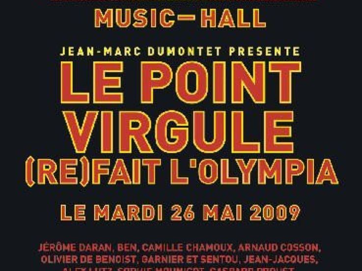 Le célèbre Point Virgule est au top de sa forme et de sa programmation artistique. Mardi 26 mai, le célèbre café -théâtre du quartier du Marais a re(fait) son Olympia, un an après y avoir célébré ses trente ans d’existence. Au programme de cette unique représentation, les coups de cœur hors programmation et les humoristes "pensionnaires" du Point Virgule. Le tout orchestré par des "tauliers" du café théâtre convertis pour l’occasion en maîtres de cérémonie : Jérôme Daran et Ben, bien secondés par Sophie Mounicot et Camille Chamoux.