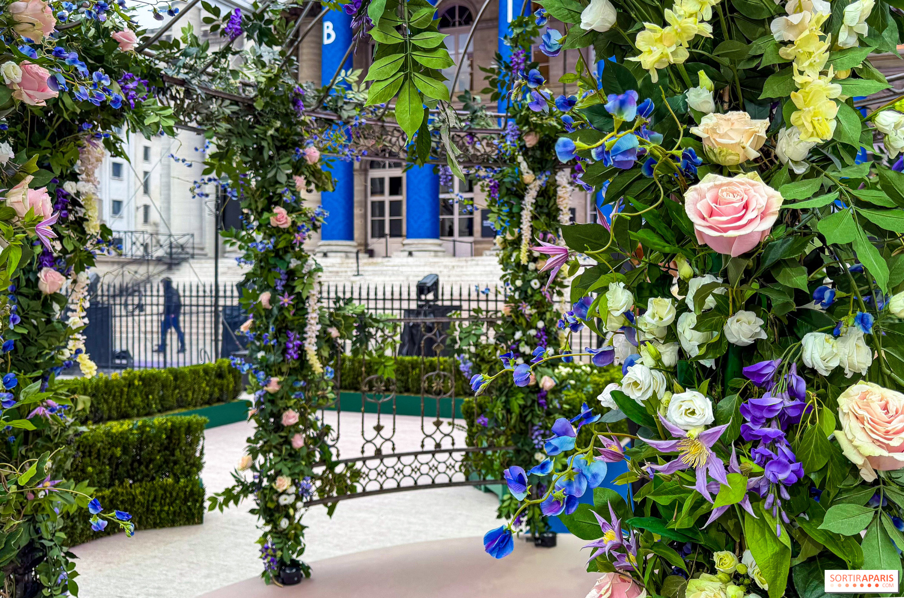 Installé devant le Palais Brongniart, dans le 2e arrondissement de Paris, ce jardin éphémère se parcourt en quelques minutes à peine. Ouvert de 10h à 20h, selon le principe du premier arrivé, premier servi, il mise davantage sur l’effet décor que sur l’expérience immersive. De 10h à 17h, on y fait quelques clichés autour de la gloriette, joliment habillée de feuillage, de roses et de glycines - le coin le plus photogénique d’une installation plutôt minimaliste.
