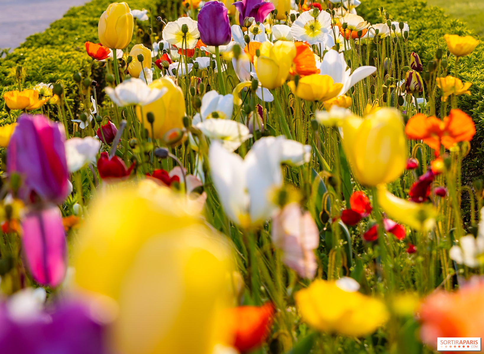 Dans le 16e arrondissement, le parc de Bagatelle fait partie des spots incontournables pour voir des tulipes à Paris. Des tulipes, des jacinthes, des aulx et des scilles composent un spectacle qui se prolonge jusqu'en juin, avant que les 10 000 rosiers ne prennent le relais. Ce jardin à l'anglaise de 24 hectares, né d'un pari audacieux entre Marie-Antoinette et le comte d'Artois en 1775, offre un cadre assez romantique, ponctué de petits ponts, de cascades et de paons en liberté. L'accès devient payant à partir du 1er avril, autour de 2,70 € en plein tarif. On conseille d'y aller en semaine pour profiter du calme et de la lumière du matin, idéale pour les photos. Notez qu'il est gratuit jusqu'à fin mars, il faut ensuite débourser la modique somme de 2,80 euros. [Lire la suite]