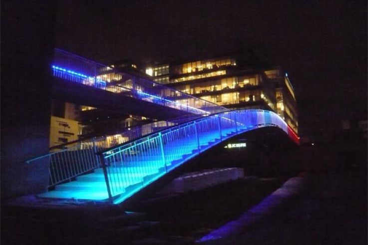 Illuminée dès la nuit tombée, la passerelle relie l'esplanade des Grands moulins à la rue M.A.Lagroua Weill Hallé. Architecte : Vong design Collaborative ; Bureau d'études techniques : TERREL International ; Eclairage : Rocky Wall ; Maîtrise d'ouvrage : SEMAPA