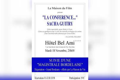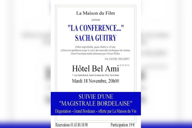 Quelle est la femme qui déclencha la carrière du maître? Elle se refusa à son père qui chassa son fils. Elle déclencha sa carrière ! Qui est-elle ? Début improbable, quasi illettré à 18 ans, il finira en apothéose jusqu'à créer de nouvelles techniques de cinéma, dont l'incontournable technique, dénoncée par Orson Welles. Féministe ou Misogyne ? Les questions trouvent réponses installées au sein de l'Hôtel Bel Ami, dans les salons luxueux et confortables de cet Hôtel quatre étoiles. En plein cour de Saint-Germain des Prés, la soirée se prolonge par vos débats autour d'un Grand Cru à l'honneur : Château de Lavagnac Millésime 2004 Cuvée Rotary International Mêlant littérature et onologie, ''La Conférence.'' Sacha Guitry, menée par un expert reconnu de la profession, est une façon conviviale d'amener le public à débattre et discuter librement. Soirée conviviale de référence Mardi 18 Novembre, 20h00 Hôtel Bel Ami 5-7 rue Saint Benoit, 75006 Paris Réservations au 01 43 80 18 98 ou 06 70 41 87 91