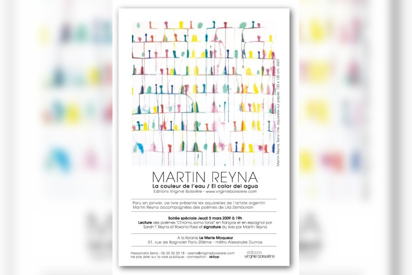 SOIREE SPECIALE JEUDI 5 MARS à 19h à la librairie "Le Merle Moqueur" 51, rue de Bagnolet 75020 Paris, en présence de l'artiste, exposition d'aquarelles, signature du livre, lecture des poèmes en espagnol par Roxana Paez et en français par Sarah T Reyna. « La couleur de l'eau » propose un dialogue entre les aquarelles de Martin Reyna et les poèmes de Lila Zemborain. Cet ouvrage est né de l'enchantement provoqué par la couleur et l'eau posées sur le papier. Plus qu'un recueil d'aquarelles c'est l'alliance de deux éléments nobles, délicats et forts à la fois qui viennent toucher notre musique intérieure. L'émotion provoquée par les aquarelles de Martin Reyna se mêle aux textes vibrants de Lila Zemborain en espagnol, avec une traduction en français de Sarah T. Reyna. Le travail de Martin Reyna reflète son ouverture culturelle, un "argentin" à Paris:) Avec cette soirée nous souhaitons partager et echanger autour de l'ouvrage, unpeu de couleur dans cette periode!Voici un lien de l'emission "Thé ou Café" sur France 2, les toiles ont été choisies pour le décor. Pour vous faire une idée.