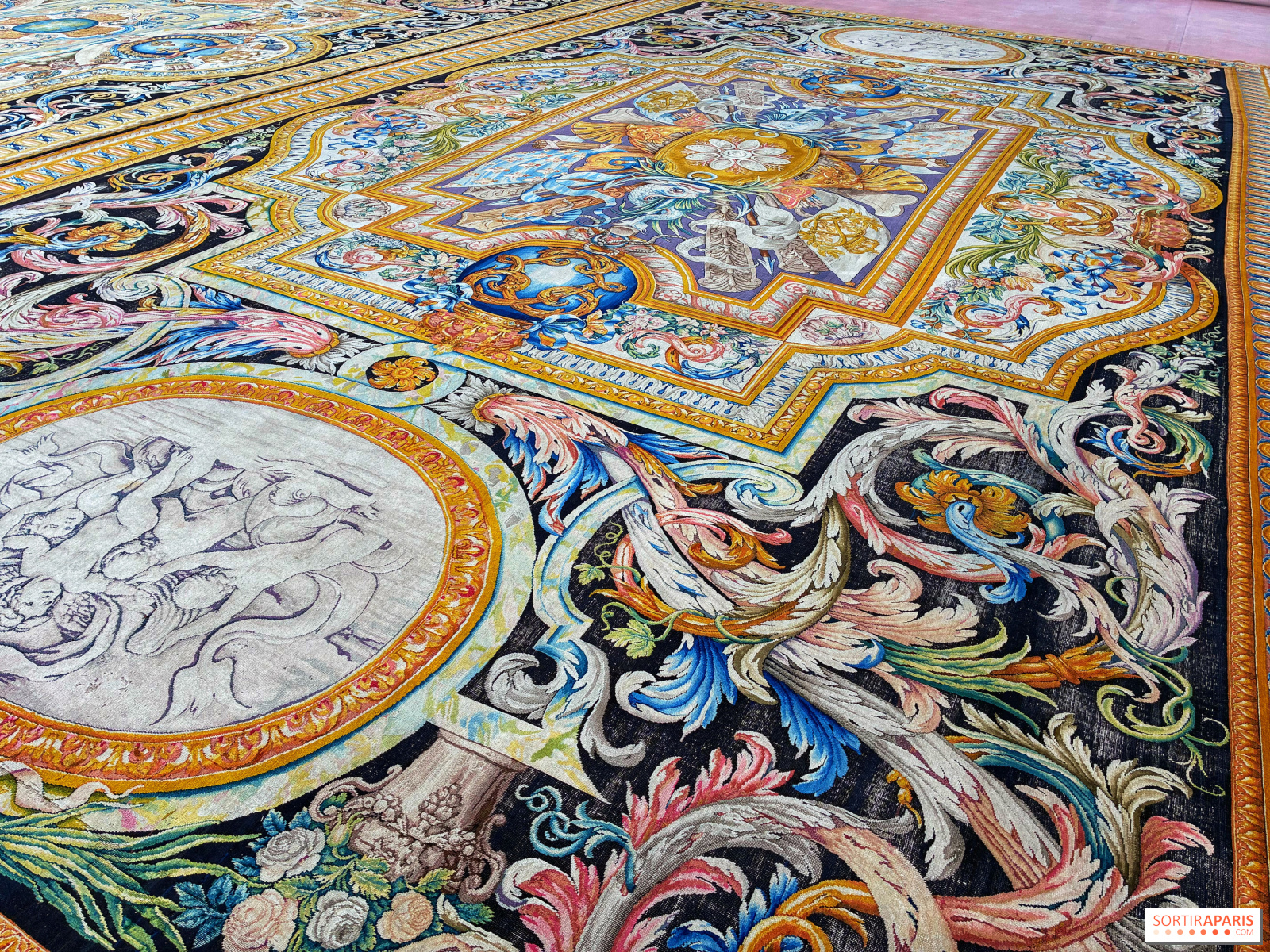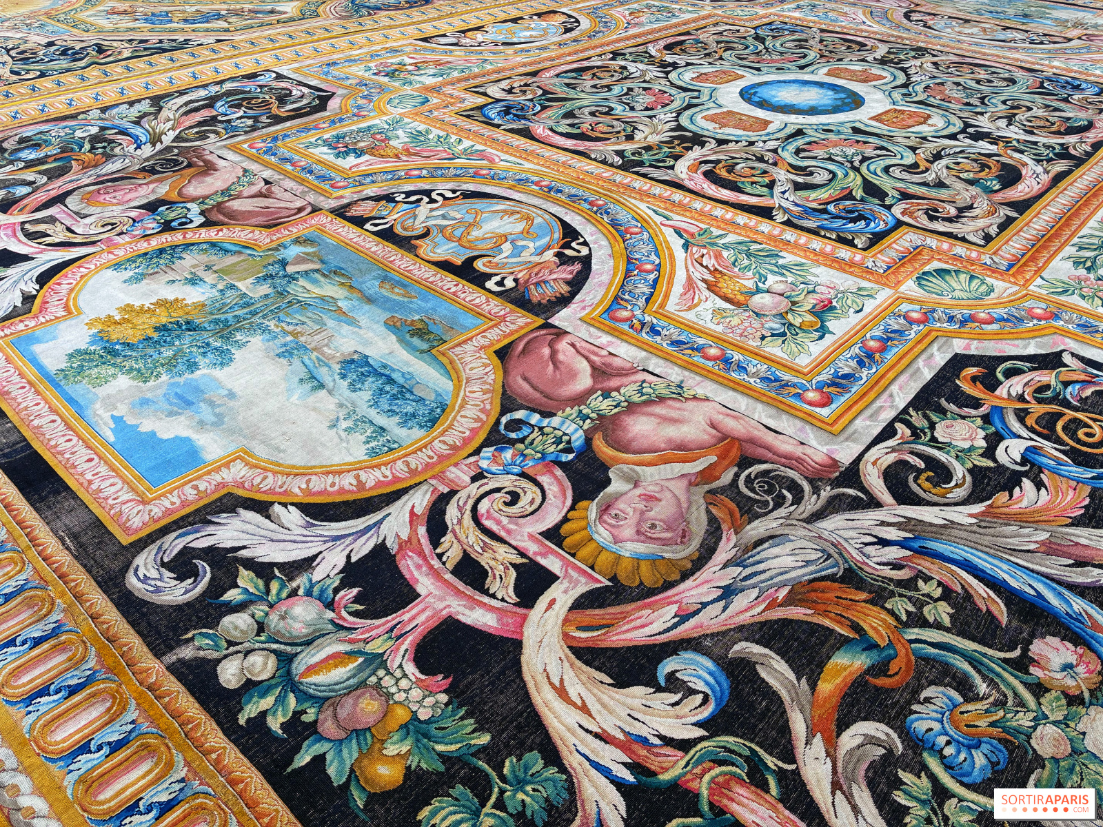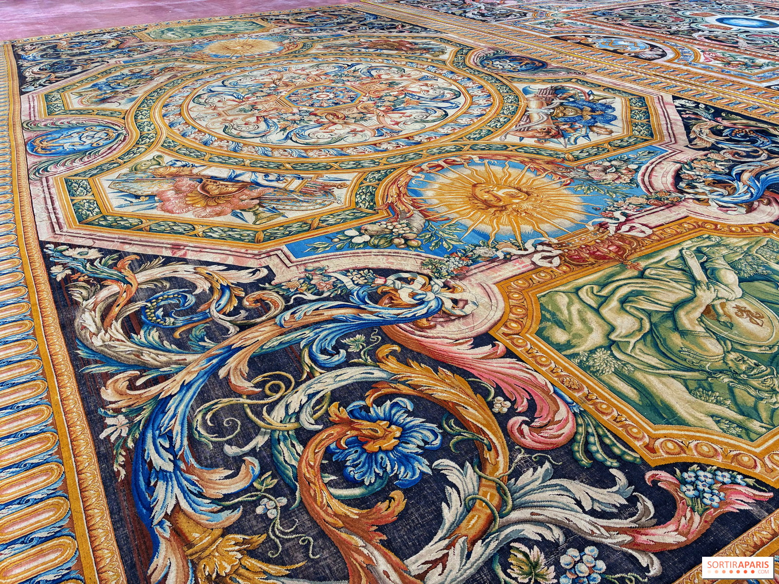 La trentaine de tapis s'étale ainsi sur le sol, prêts à être admirés en détail, accompagnés en face par un ensemble de tentures, L'Histoire du Roi, tout aussi exceptionnels. Evidemment, il faut apprécier ce savoir-faire de la tapisserie ou en être curieux pour se rendre à cette exposition, car ce sont les seuls éléments présents.