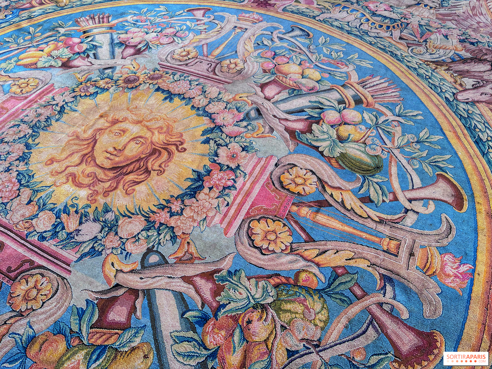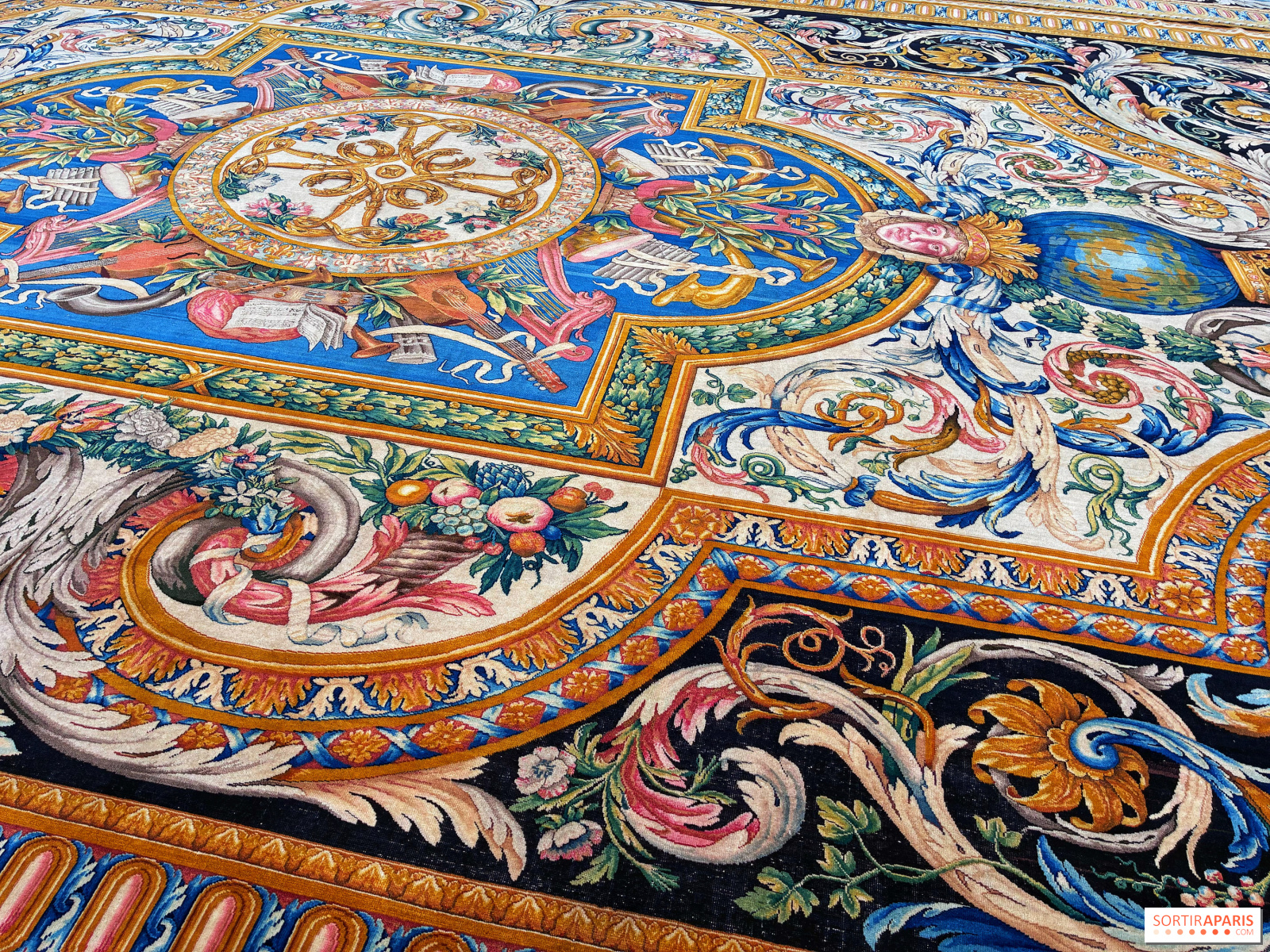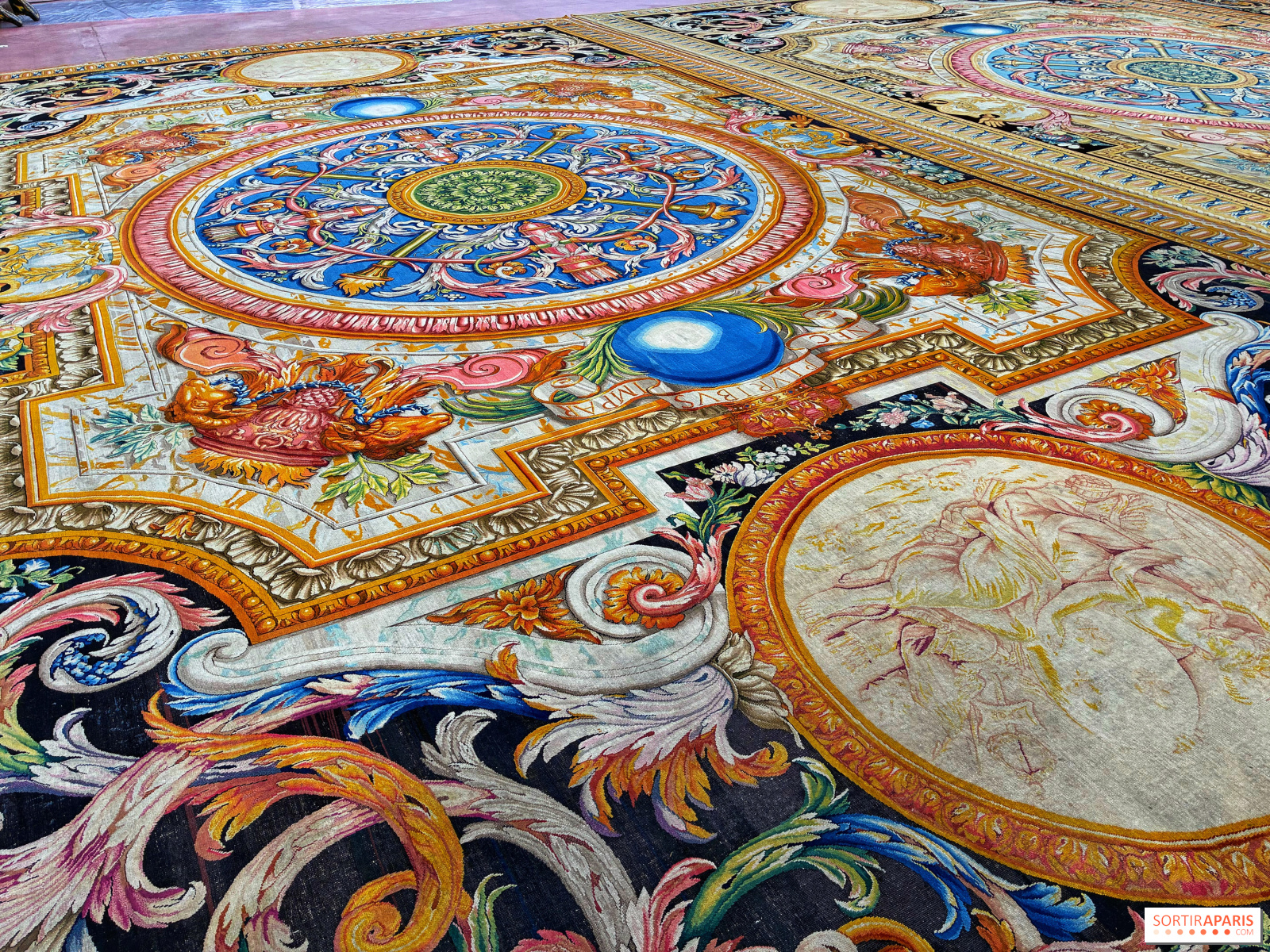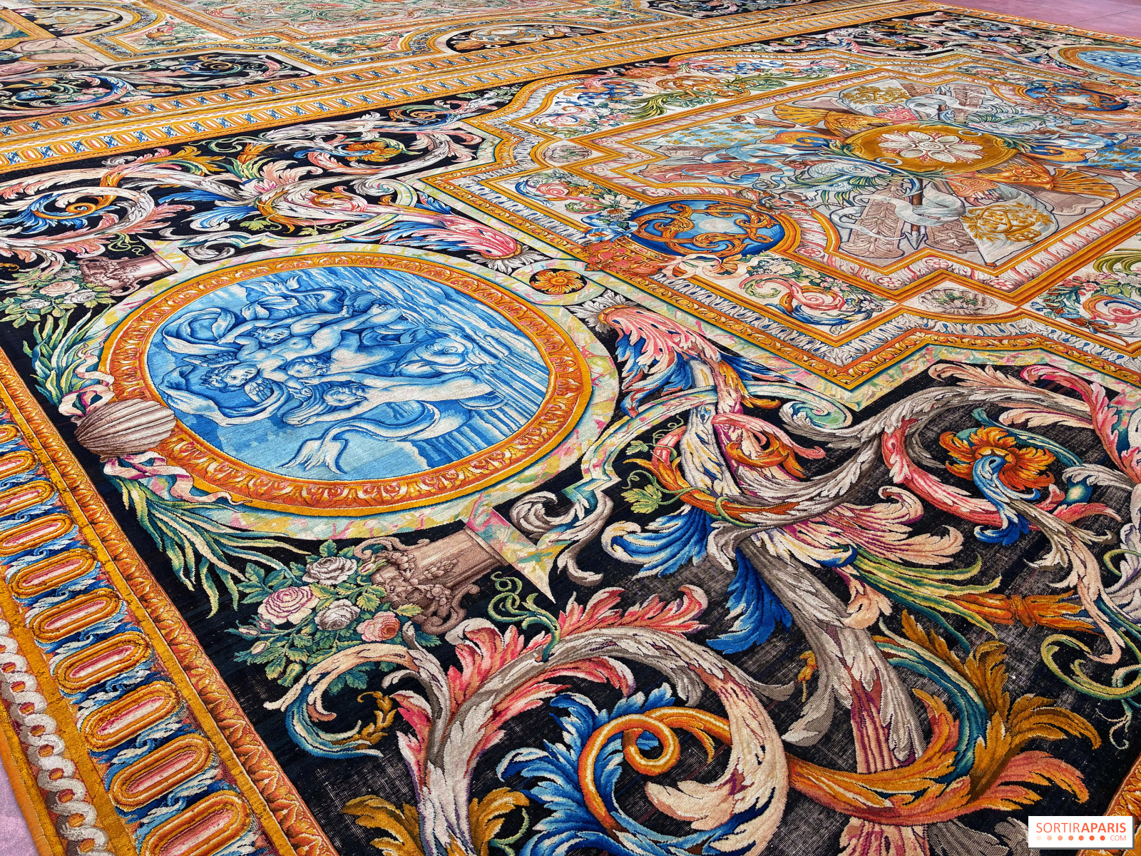 La trentaine de tapis s'étale ainsi sur le sol, prêts à être admirés en détail, accompagnés en face par un ensemble de tentures, L'Histoire du Roi, tout aussi exceptionnels. Evidemment, il faut apprécier ce savoir-faire de la tapisserie ou en être curieux pour se rendre à cette exposition, car ce sont les seuls éléments présents.