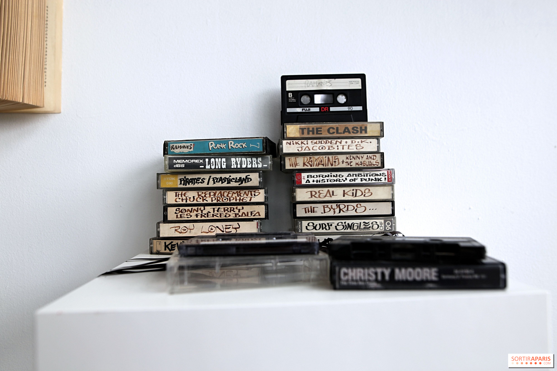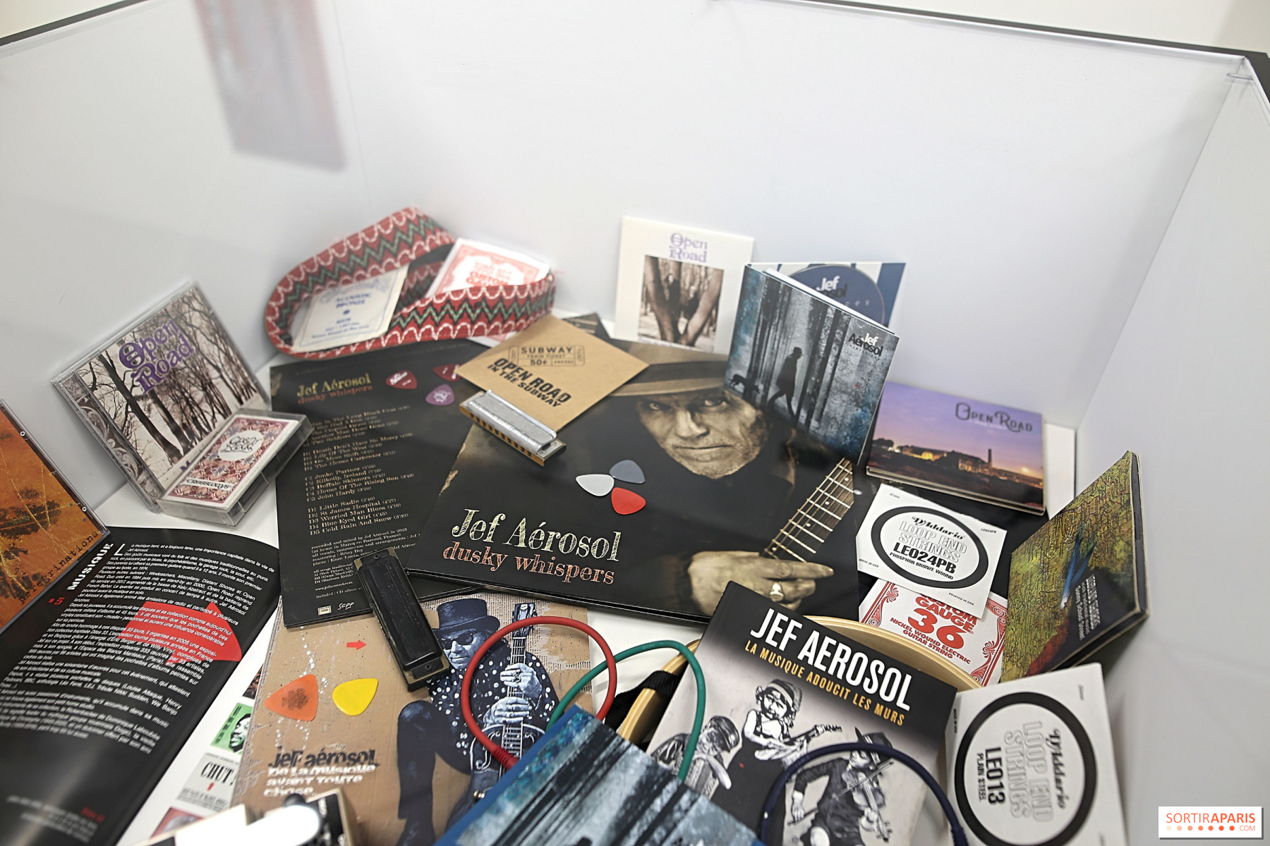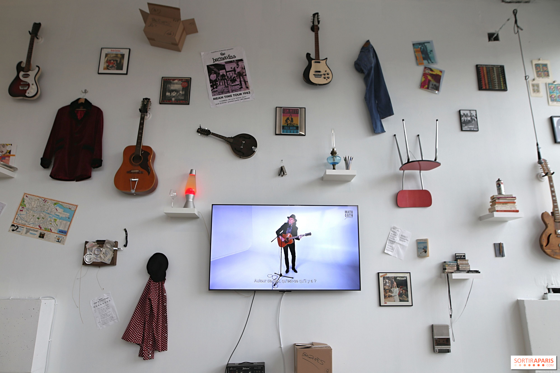 Et c'est d'ailleurs en chanson que nous sommes accueillis à la galerie. Dans l'entrée de l'espace éphémère, un écran diffuse en continu plusieurs des nouvelles chansons de l'artiste, dont le clip du morceau "Autour de moi". Le musicien et chanteur y parle des différents objets qui l'entourent et l'accompagnent depuis plusieurs années, comme des guitares, une chaise en formica, un vieil ampli, des harmonicas, des cassettes audio des Clash, un vinyle de Bob Dylan, un vieux magnéto ou encore une lampe à lave de l'époque du festival de Woodstock. Autant d'objets appartenant à l'artiste et qui sont justement exposés et suspendus sur un grand mur dans l'entrée de la galerie. Non loin de là, un immense autoportrait de Jef Aérosol posant avec sa guitare a été réalisé pour l'occasion.