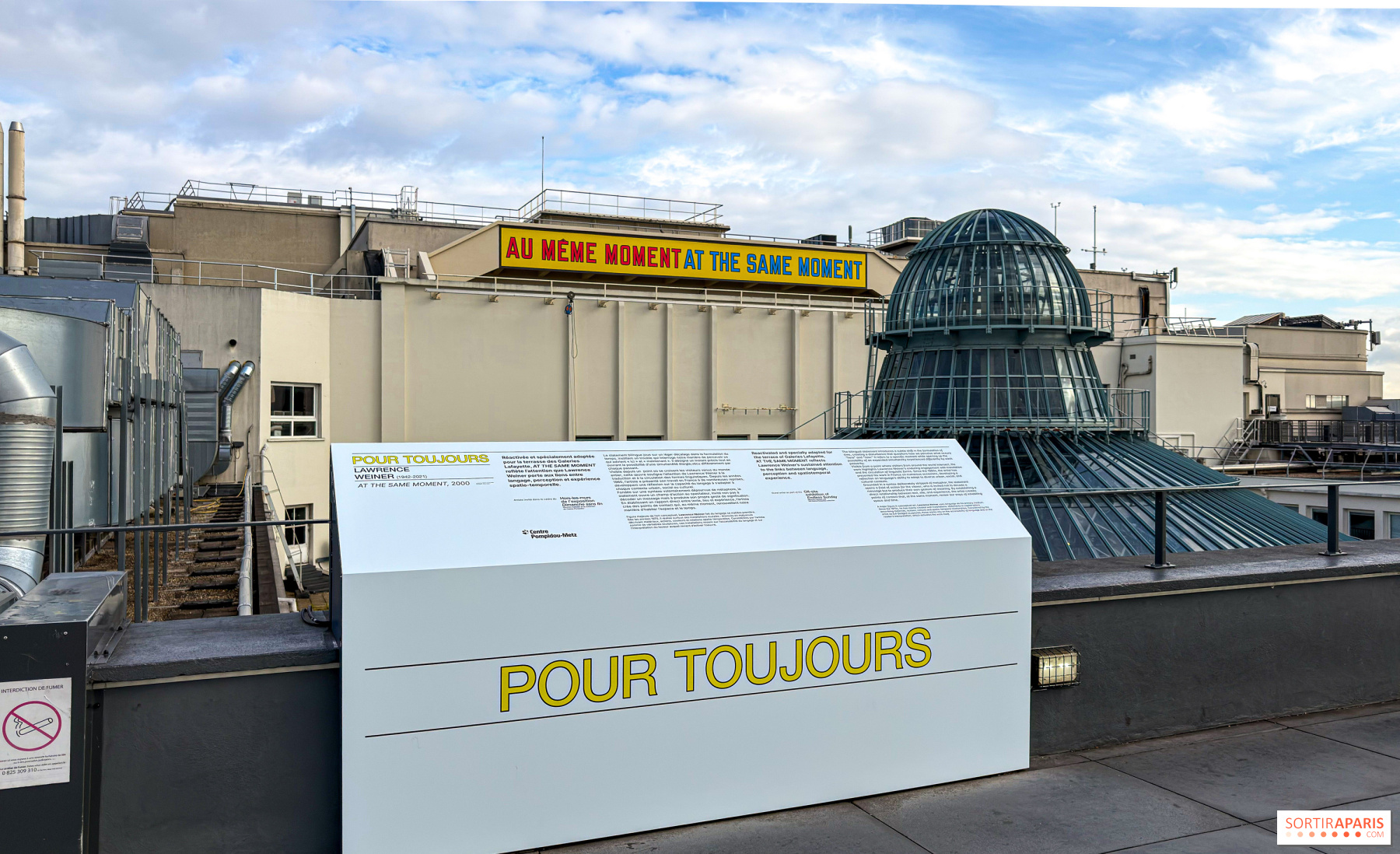 Sur la terrasse panoramique, AU MÊME MOMENT AT THE SAME MOMENT de Lawrence Weiner déploie un statement bilingue où le langage agit comme sculpture, interrogeant simultanéité, perception et expérience du temps.