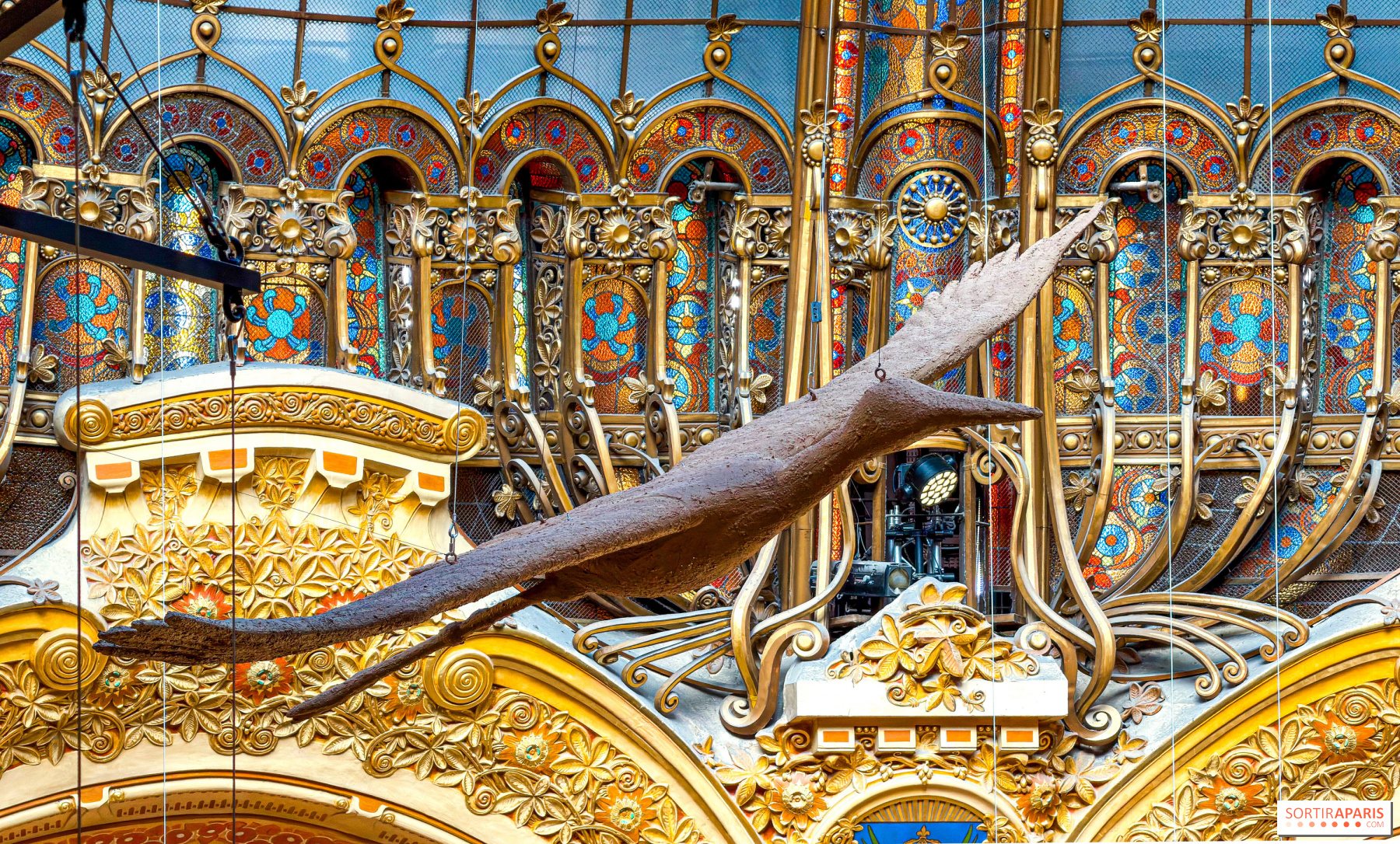 Sous la coupole emblématique du boulevard Haussmann, Mammalia de Gloria Friedmann transforme l’architecture en système solaire vivant. Sculptures animales en terre — cerf, ours, loup, tortue, âne, paon et un immense héron en plein envol - gravitent autour d'un corps féminin monumental sous la coupole pensée comme source originelle, mémoire profonde du vivant et point de rassemblement d’une constellation à la fois fragile et puissante.