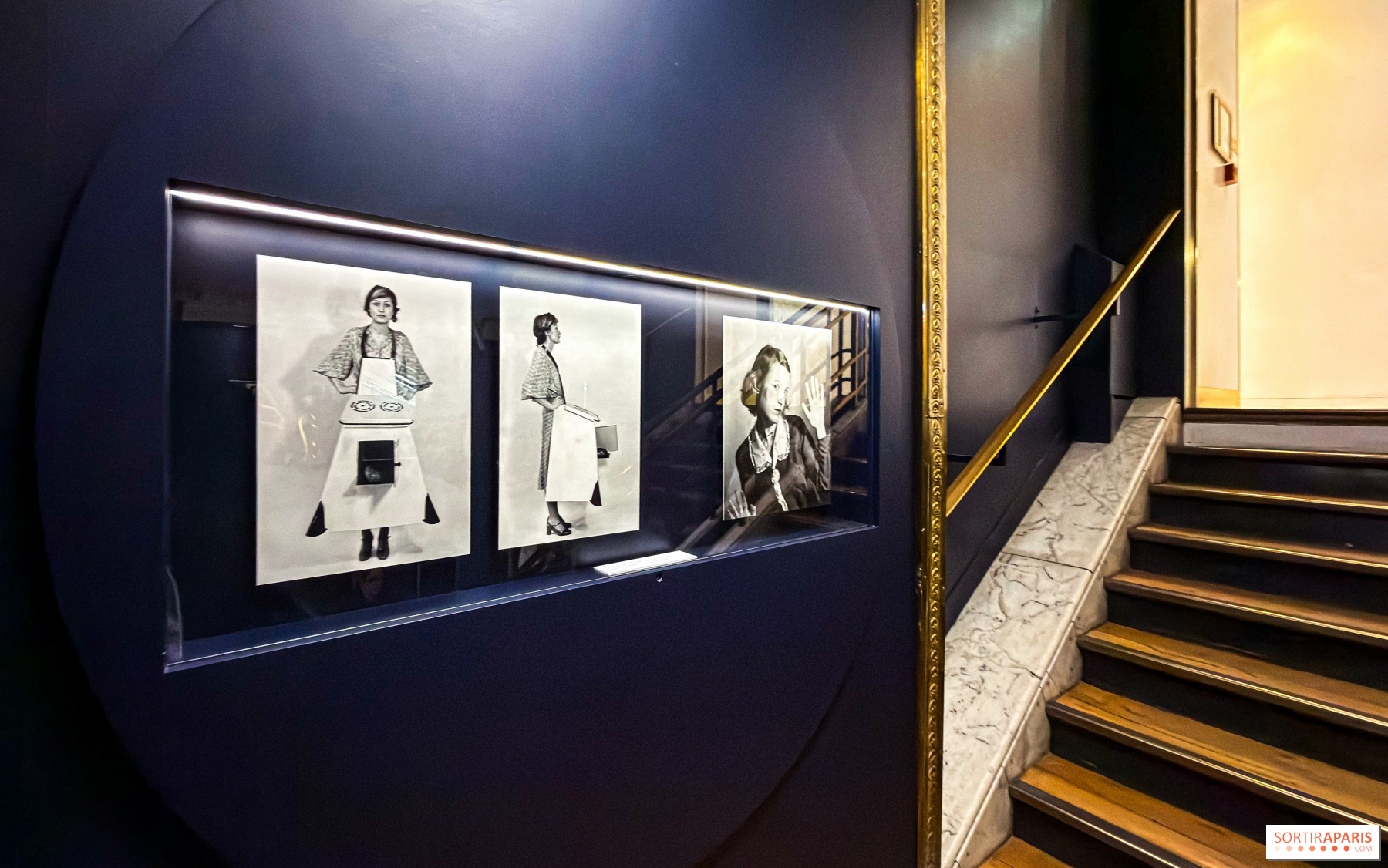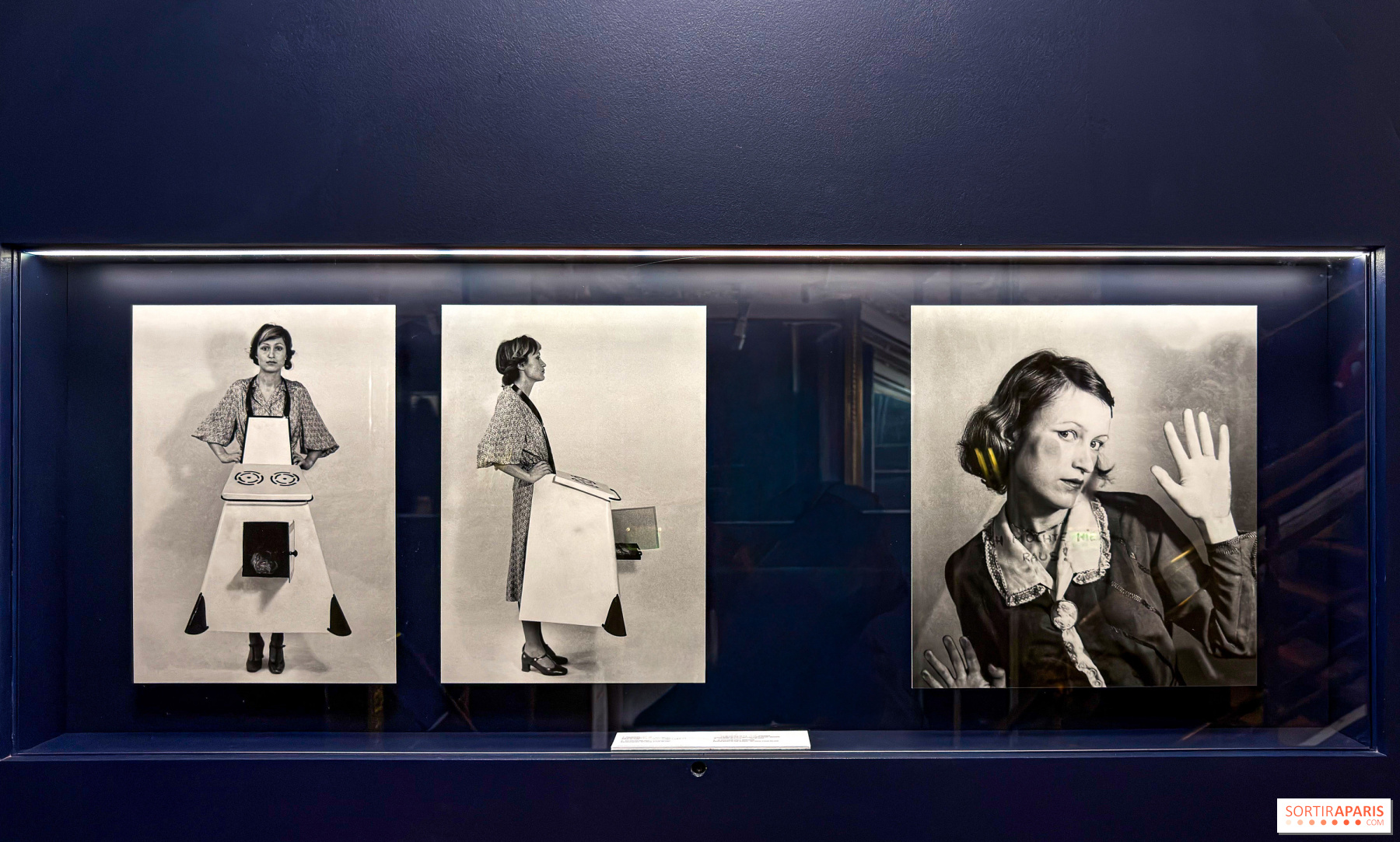 Dans les vitrines murales de l’escalier, les photographies de Birgit Jürgenssen composent un parcours non chronologique, des années 1970 aux années 1990. Figure essentielle de l’avant-garde féministe viennoise, l’artiste détourne avec ironie les rôles sociaux féminins, utilisant son propre corps pour mettre en crise les stéréotypes de genre.