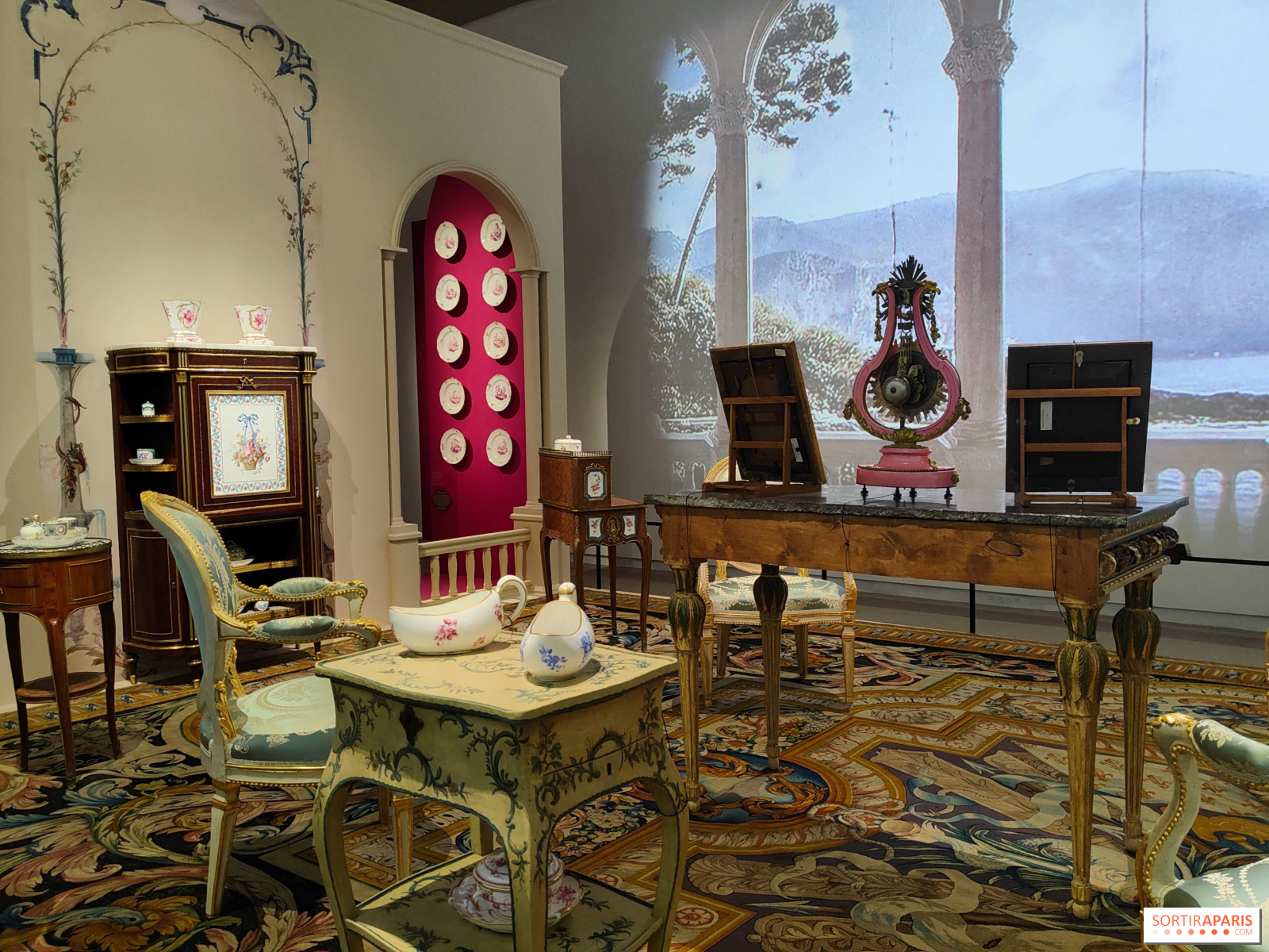 Le Mobilier national a remis ces œuvres dans leur écrin, en recréant des intérieurs des maisons des Rothschild. Grâce à des meubles et des décorations sorties des réserves de la Villa Ephrussi de Rothschild, et de plusieurs musées et collections privées, l'exposition a pu reproduire des salons et des pièces où les porcelaines étaient exhibées.