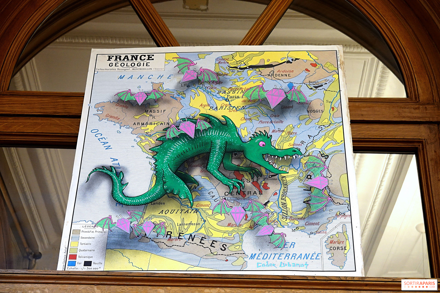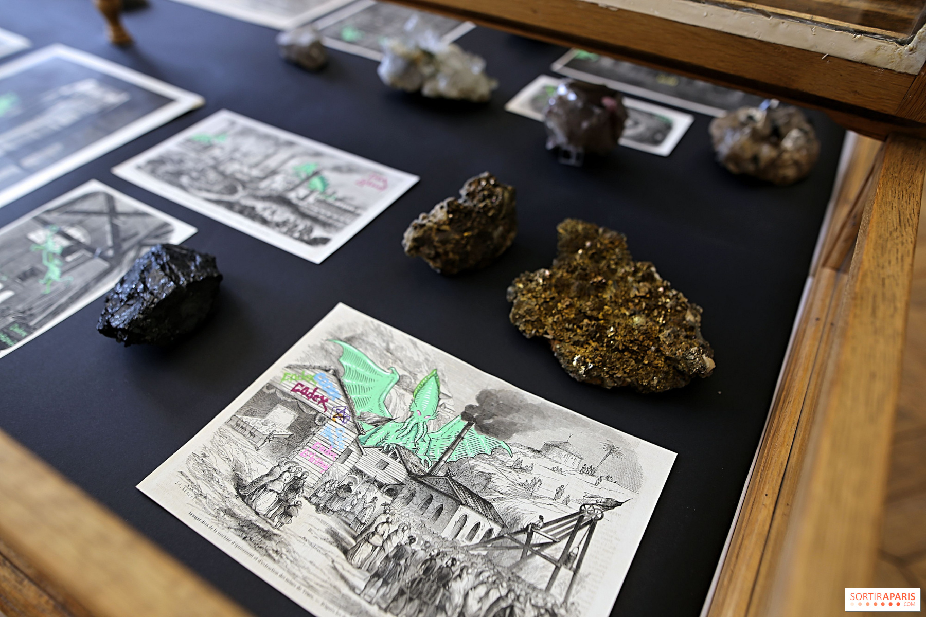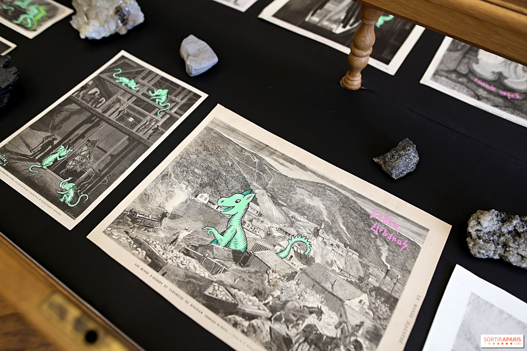 Pour cette exposition, le street artiste a notamment laissé son empreinte sur des plans et dessins du bâtiment de l'École des Mines, des pierres-paysages et bois pétrifiés ou encore sur de vieilles gravures de minéralogie du XVIIIe siècle. En y regardant de plus près, on y découvre notamment une nouvelle famille d'invertébrés minéraux, inspirés par les échantillons du musée présentés juste à côté des gravures.