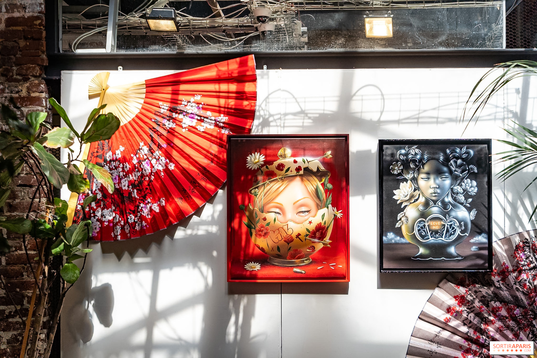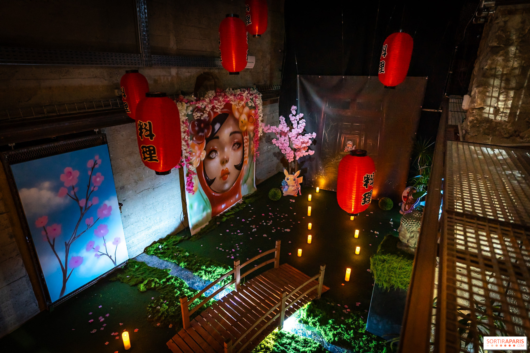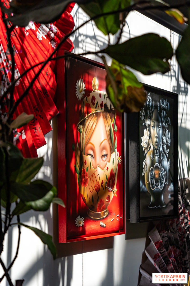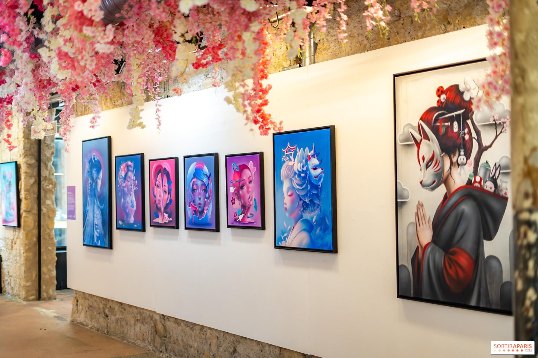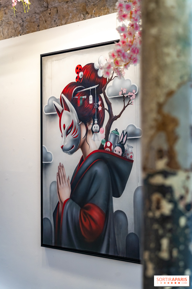 Le lieu en dit déjà beaucoup sur l'ambition du projet. Nichée au 12 Passage Choiseul, l'Espace Cinko est une ancienne imprimerie de 200 m² qui se transforme pour l'occasion en un Japon reconstitué, avec fleurs de sakura, lanternes et boutique japonaise. Ce passage couvert du 2e, à deux pas de la rue Sainte-Anne surnommée Little Tokyo pour sa concentration de restaurants japonais devient le décor idéal pour une scénographie immersive pensée par la galerie en symbiose totale avec l'œuvre de l'artiste.