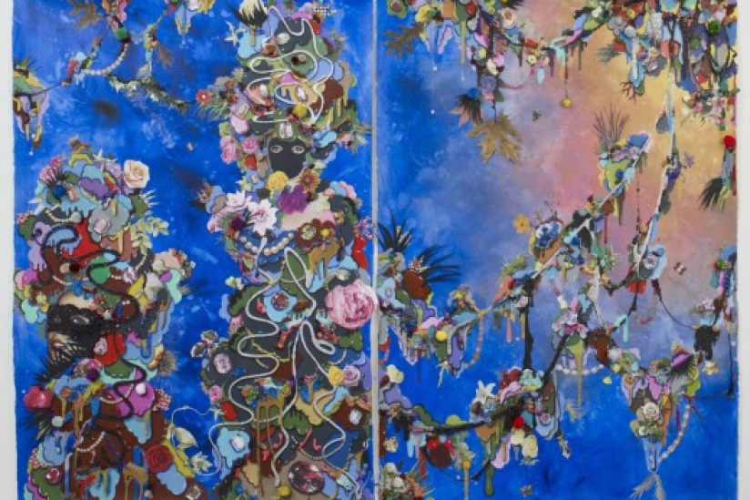 En deuxième coup de cœur, nous avons les œuvres d’Alicia Paz, pour la Galerie Dukan Hourdequin. Chez Alicia, vous découvrirez une joyeuse farandole de toiles colorées aux allures de femmes, et plus rarement, de monstres. Toute la complexité d’un paradis terrestre et acidulé apparaît dans des toiles qui allient image, peinture ou trompe-l’œil, pour un résultat saisissant. Jeux de rôles, qui sont ces femmes qui vous regardent dans le blanc des yeux ? La transformation de l’âme, comme de l’apparence, est-elle possible ? Arrêtez-vous, ça vaut le coup d’œil… Et c’est effectivement un havre de paix (de paz… mouais) qui se dégage de ce stand.