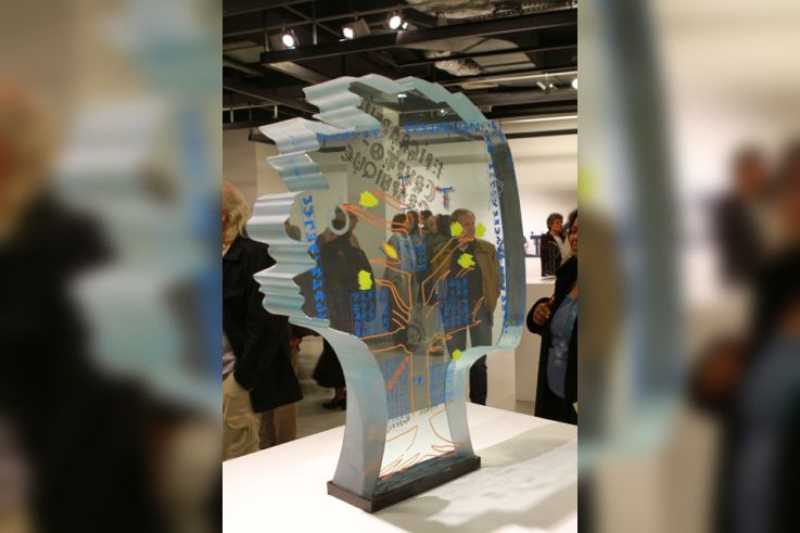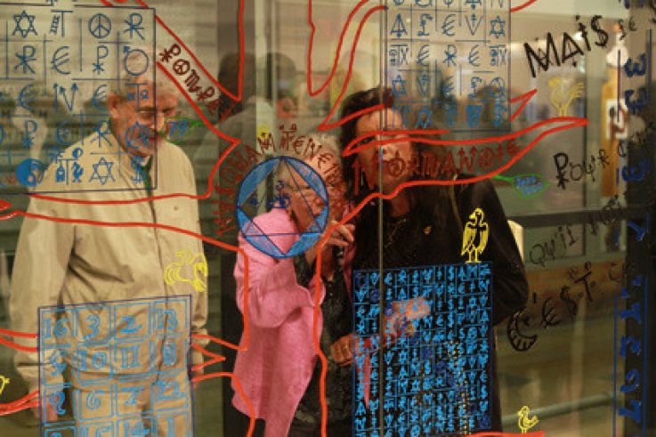 Une occasion unique de découvrir en trois dimensions, au cœur de la matière, les fameuses écritures de Villeglé, mêlant symboles monétaires, religieux et politiques. La première réalisation fut le mot "yes", décliné de plusieurs façons, en acier corten notamment, puis en inox. Il n'a eu de cesse ensuite de multiplier les matériaux, comme les supports et l’échelle de ses écritures dans l’espace, mené par son inaliénable goût pour ce qui fait sens.