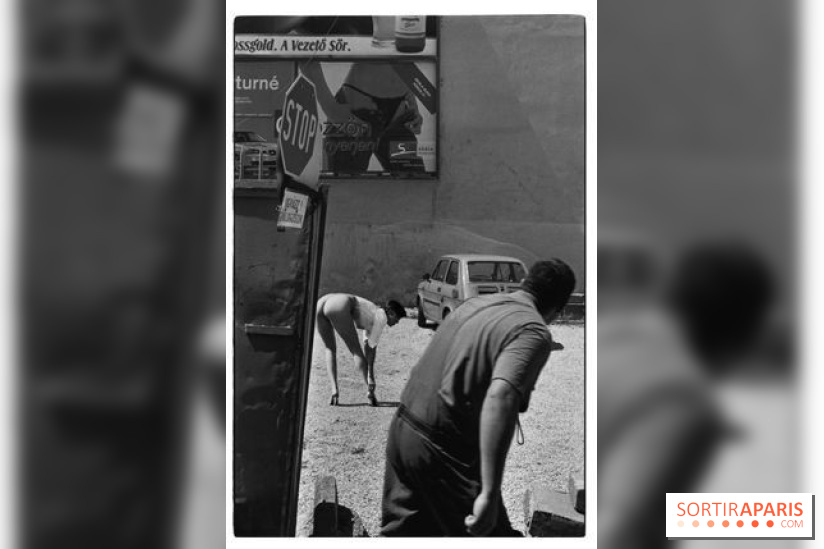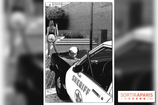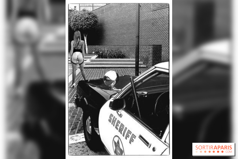 Regardez bien : l’art de Dahmane va loin dans la fusion de la chair avec les éléments de son espace. Cette femme qui se distingue à peine des sculptures auxquelles elle se mêle… ou bien, photo si élégante, ce corps dont le porte-jarretelles fait signe au même titre que les lettres tracées en graffitis sur le mur. Et si parfois Dahmane impose brutalement un corps où il n’a pas lieu d’être, regardez mieux : cette femme nue, si gaie devant la guérite de bois « Police Information Box », croise ses mains sur son sexe, reprenant le croisillon qui décore les deux fenêtres. Dans l’un et l’autre cas, motif d’architecture, motif décoratif…Tant de signes se font signe, inventant ensemble l’histoire commune de la femme et de la ville.
