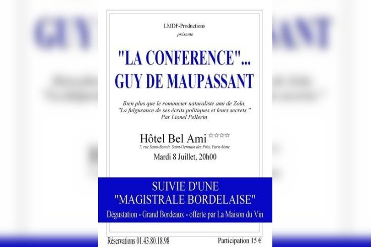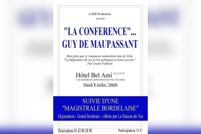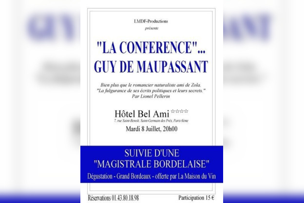 ...Venez découvrir un Maupassant polémique dont l'audace et la liberté d'esprit ont nourri ses chroniques, peu connues, révélatrices d'une grande conscience politique, révélées à vous aujourd'hui. C'est le portrait d'un penseur politique ultramoderne et à contre-courant que dresse Lionel Pellerin, Président de la Compagnie du théâtre des Arts et des Lettres, Ancien administrateur de la société des Poètes français, et à l'affiche en ce moment au Théâtre Marigny ; au cours de cette conférence.