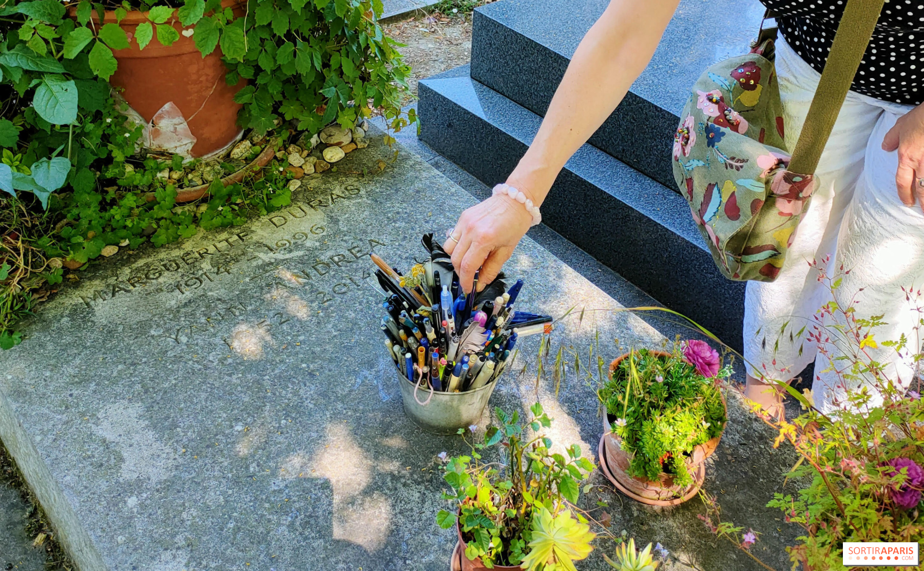 Célèbre écrivaine et dramaturge française, Marguerite Duras reçoit comme hommage quotidien cette plantation insolite de stylos, de feutres et de crayons, venus l'accompagner même dans sa dernière demeure. De toutes les couleurs, ces petits bouts d'écriture apportent de la gaieté à la tombe, aux côtés de la petite marguerite déposée sur un pot de fleurs.