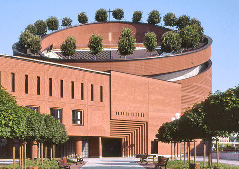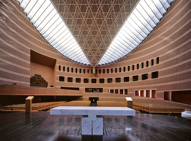 La cathédrale adopte une forme circulaire, symbole d’éternité et de rassemblement. Ses murs, composés de briques rouges, rappellent subtilement la tradition tout en affirmant une esthétique moderne. Mais l’élément le plus surprenant se trouve au sommet : 24 tilleuls plantés sur le toit, visibles depuis l’extérieur, comme une couronne végétale suspendue au-dessus du sacré.