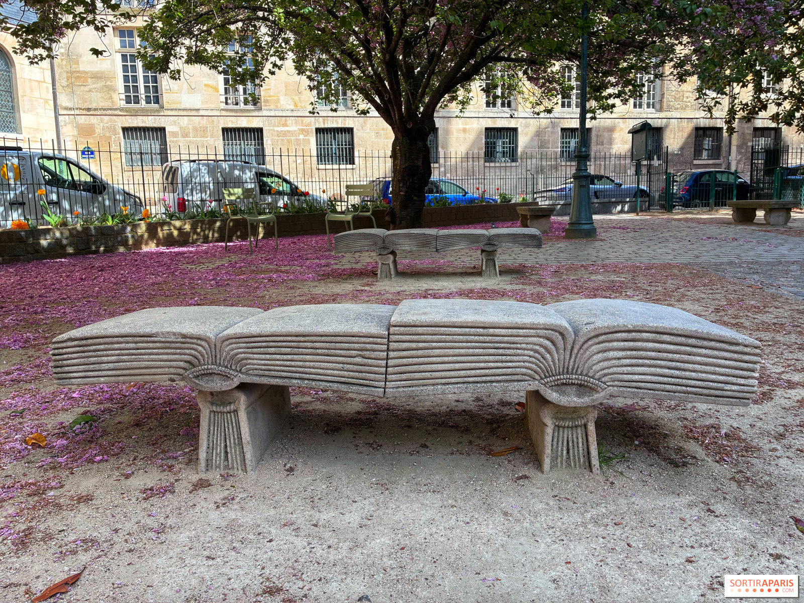 Juste derrière l'Institut de France, non loin du Pont des Arts, se trouve un petit square caché par l'immense bâtisse, qui recèle quelques étrangetés. Parmi eux, la forme insolite de deux de ses bancs, au milieu d'une dizaine quant à eux tout à fait normaux ! À tel point que si l'on est un peu fatigué ou pas très observateur, on les manque facilement ! Faits de calcaire, ils représentent de beaux livres ouverts ouvragés, avec pour pieds des livres fermés.