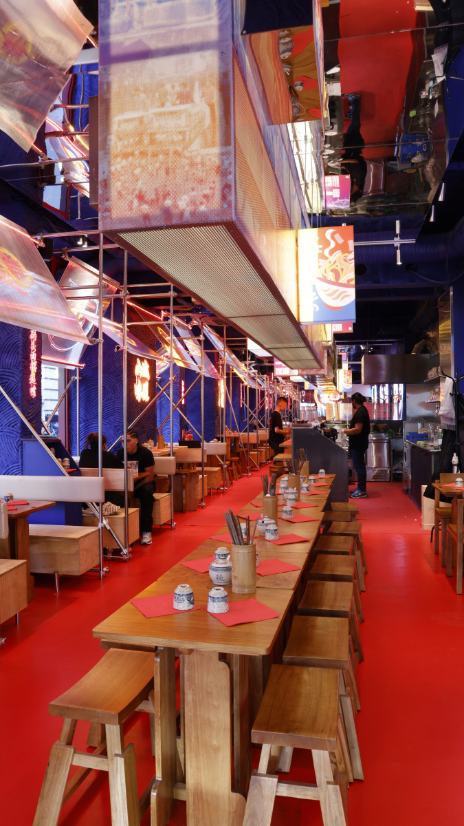 U vchodu vás prostředí zavede na senzorickou cestu Čínou. Výrazné zdi, červené lucerny, neonové osvětlení a pestré detaily ctí Chongqing, obří metropoli v Sichtuanu, která je přezdívána největším městem na světě. Každý detail dekorací byl pečlivě navržen tak, aby tento prostor proměnil v opravdový chrám čínského street food v Paříži. Atmosféra je živá, radostná a pohlcující, na pomezí městské jídelny a asijského trhu s nočním obživou.