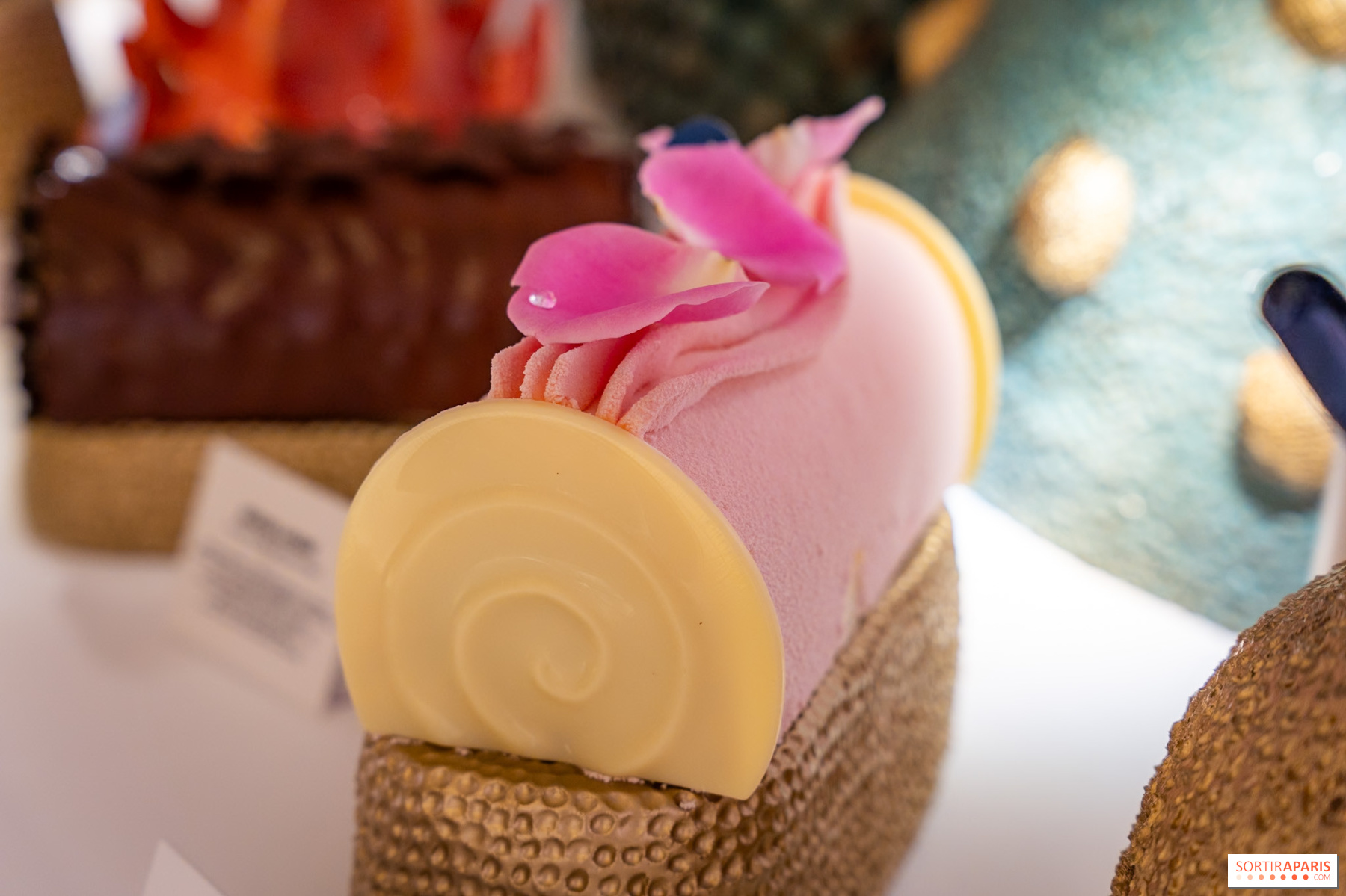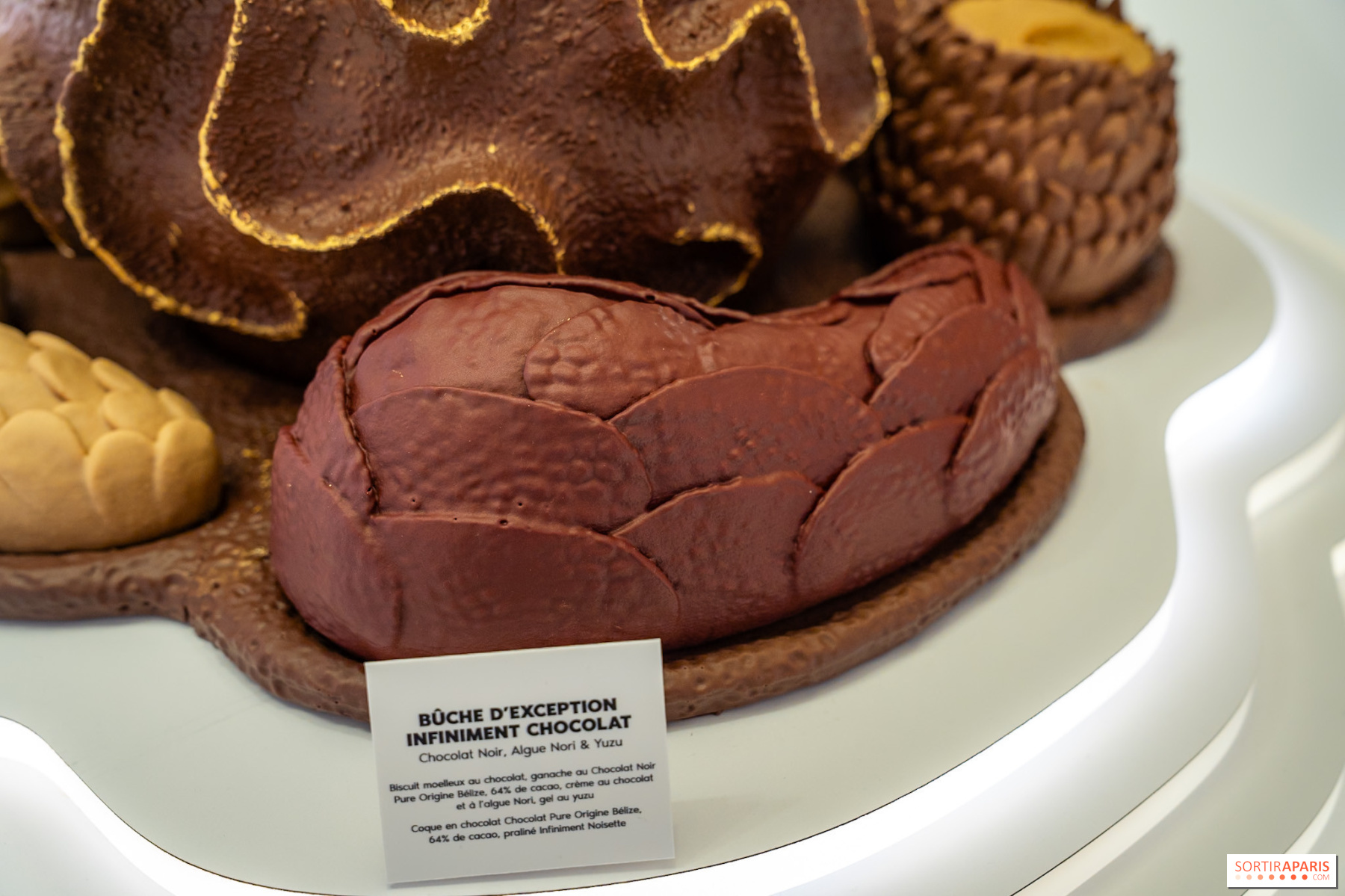 Začněme absolutním hitem: dort Nérée, výjimečný kousek za 430 € pro 12 osob. Je zabalený v čokoládové skořápce, která napodobuje členité útesy, a naplněný pralinkou Infiniment Noisette. Pod touto spektakulární skořápkou se skrývá kopule z hořké čokolády Pure Origine Bélize, která se odvážně kombinuje s řasou Nori a yuzu. Mořské a kouřové tóny řasy se snoubí s svěžestí japonského citrusu, je to odvážné a funguje to. K dispozici pouze na objednávku 23. a 24. prosince 2025.