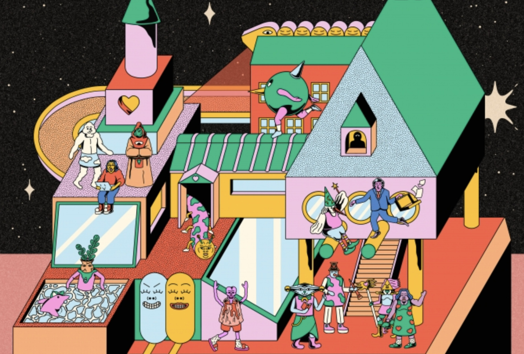 ACID Cannes er en boble åben for alle midt i Cannes: ingen sortering ved indgangen, ingen rød løber. Kun film. For at gøre denne idé håndgribelig har jeg valgt huset som universelt tilflugtssted, bygget af sten og mursten, beboet på tusind måder. Et hus der opfinder sig selv undervejs, ligesom festivalen der hvert år genskaber sig selv i kanten af den store forestilling. kunstneren uddyber.