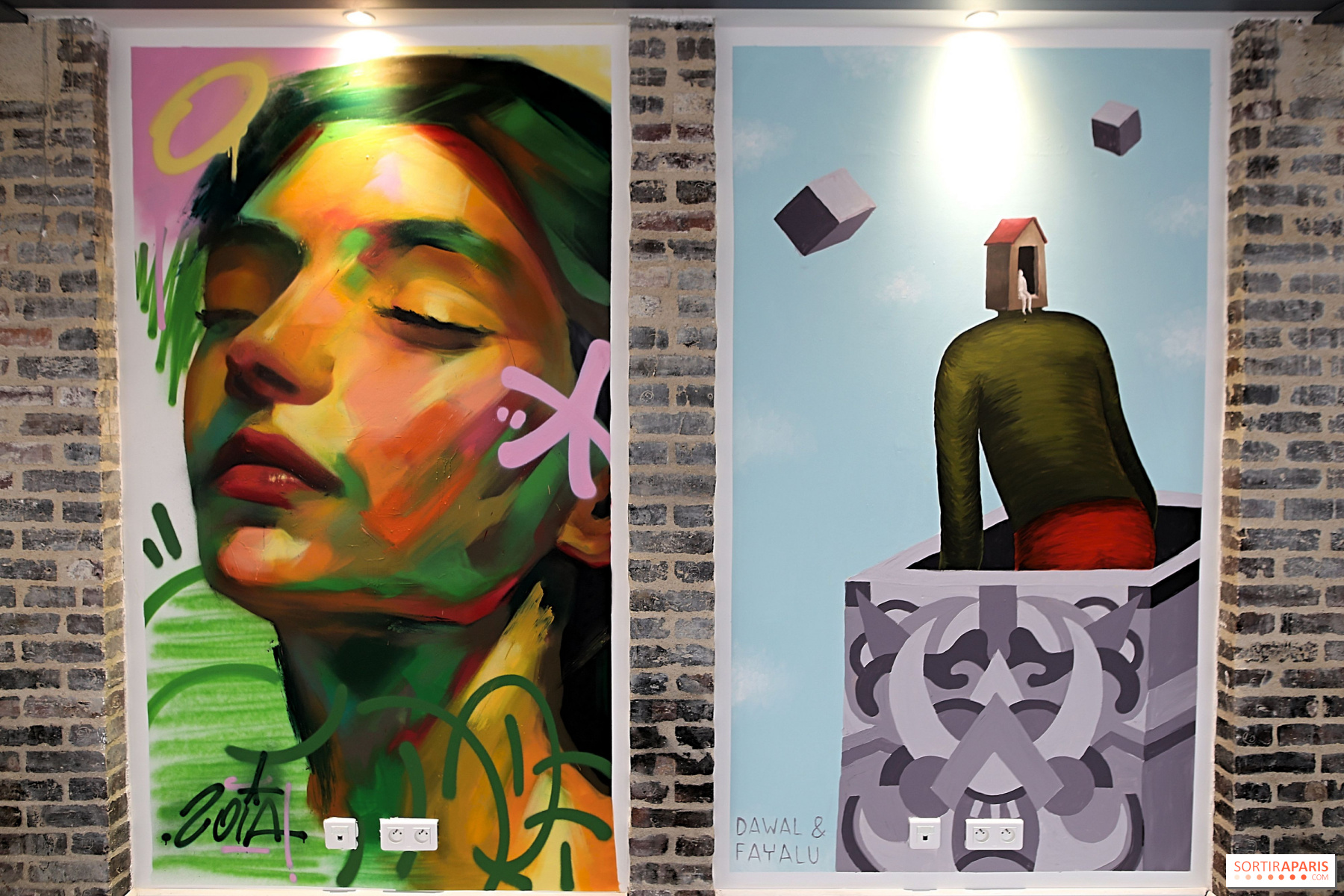 Vi går op ad trappen, støder på andre fresker og træder ind i et rum badet i lys. Det er her, hjertet af Salon des Bombasphères befinder sig. Mens mezzaninen vil være vært for de berømte live-malerier i fire weekender, afslører stueetagen i dette smukke rum en række fresker signeret Ardif, Dawal & Fayalu og Remi Cierco.