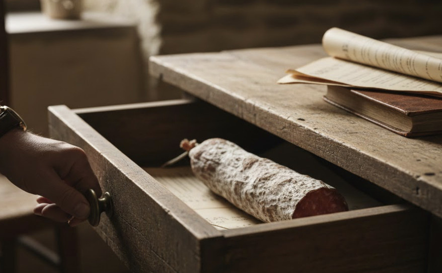 Placering lige ved vinduet, hvor man kan nyde lyset fra Auvers, gemmer dette bord på en ganske særlig historie usædvanlig. Malraux var en stor madentusiast og elskede især den lokale pålægsdelikatesse. For at ære ham har man i stedet for en tradition oprettet en helt unik skik: En saucisson er altid placeret i skuffen under bordet.
