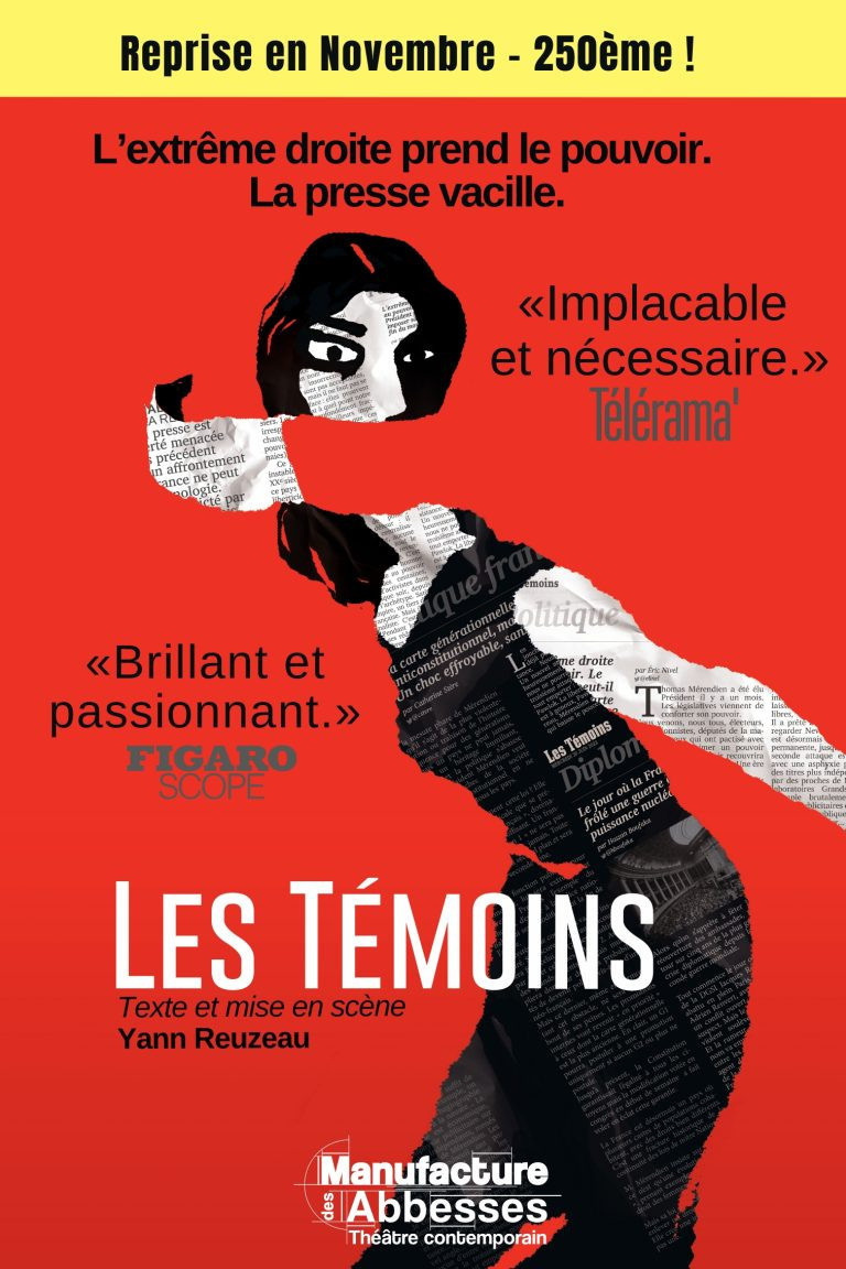 Die Manufacture des Abbesses präsentiert Les Témoins, ein Werk von Yann Reuzeau, das politische Auswüchse und die Pressefreiheit im Kontext eines demokratischen Umbruchs hinterfragt. Das 2019 entstandene Stück kehrt 2025-2026 parallel zu Des ombres et des armes, einem weiteren Werk des Regisseurs, in einem Diptychon zurück, das sich mit den Spannungen in der heutigen Gesellschaft befasst. In einem turbulenten politischen Klima begleitet das Stück eine Redaktion, die mit dem Machtantritt eines rechtsextremen Präsidenten konfrontiert ist und dringend ihre beruflichen Grundsätze bewahren muss.