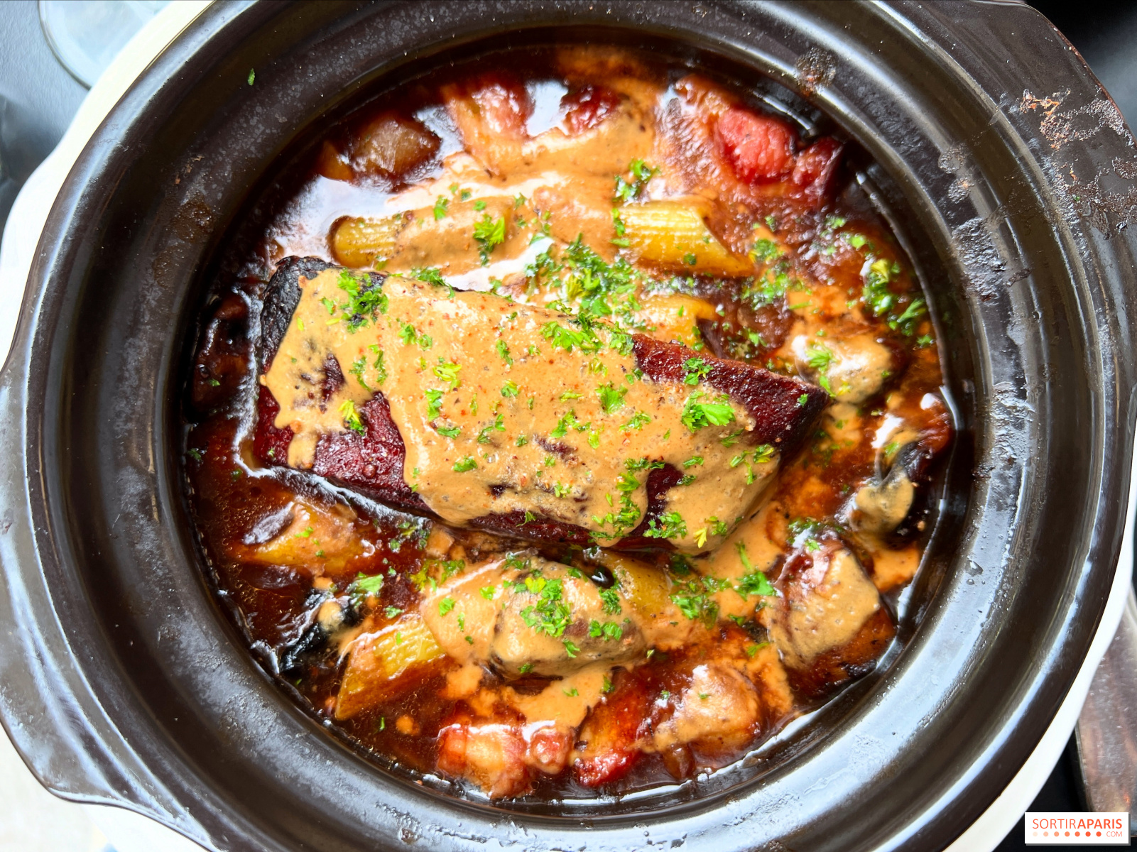 Die gleiche kulinarische Dichotomie gibt es auch bei den Gerichten, zum einen einen sorgfältig gegarten Oktopus aus dem Mittelmeer und gegrillten Halloumi, begleitet von einem Kartoffelpüree (28€), zum anderen ein in Cahors eingelegtes, rassiges Rinder filet, das mit Kartoffeln, Speck, Champignons und Frühlingszwiebeln serviert wird. Ein überaus großzügiges Gericht, das man fröhlich bis zum letzten Tropfen sautiert, indem man das Brot in den Topf wirft, und zu dem man gerne ein Glas Wein trinkt.