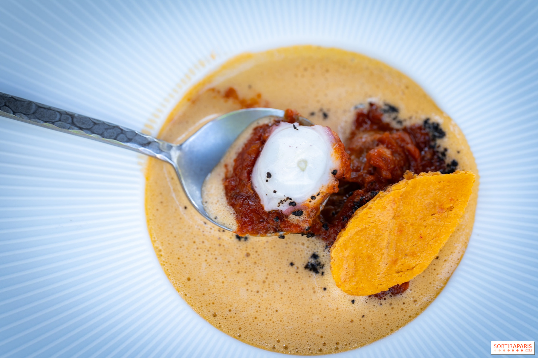 Auf dem Menü unserer Entdeckungen entdecken wir nach einer schönen Auswahl an raffiniertenAmuse-Bouches, die aus Gänseleber und Erbsen bestehen und unseren Appetit anregen, eine subtil geräucherte Makrele à la flamme, begleitet von Piquillos und einem rauchigen Senf, der durch einige Bärlauchsprossen verfeinert wird. Ein Gericht, das mit den Texturen und der Lebendigkeit spielt.